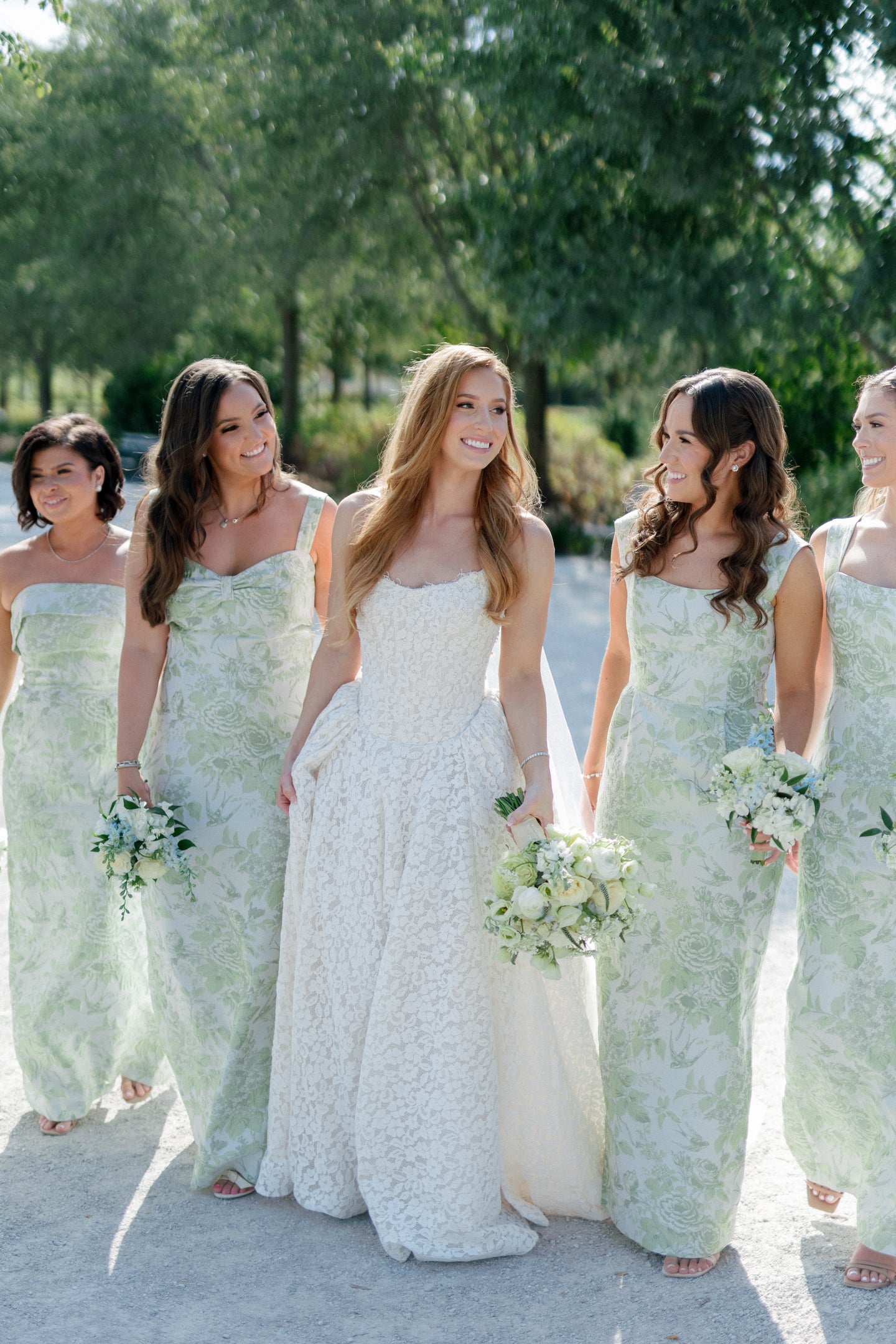 The Hubers, Congratulations! What a gorgeous day! Bridesmaids wearing Lulakate Spring Green Garden Flora jacquard in a mix of silhouettes. Fresh, timeless and absolutely stunning.