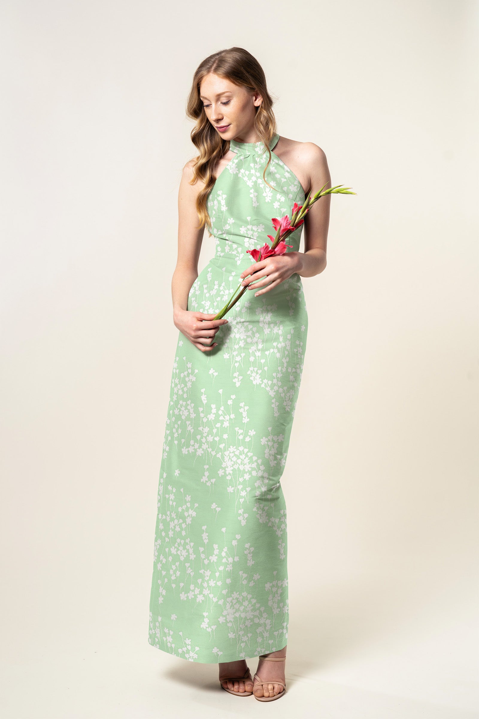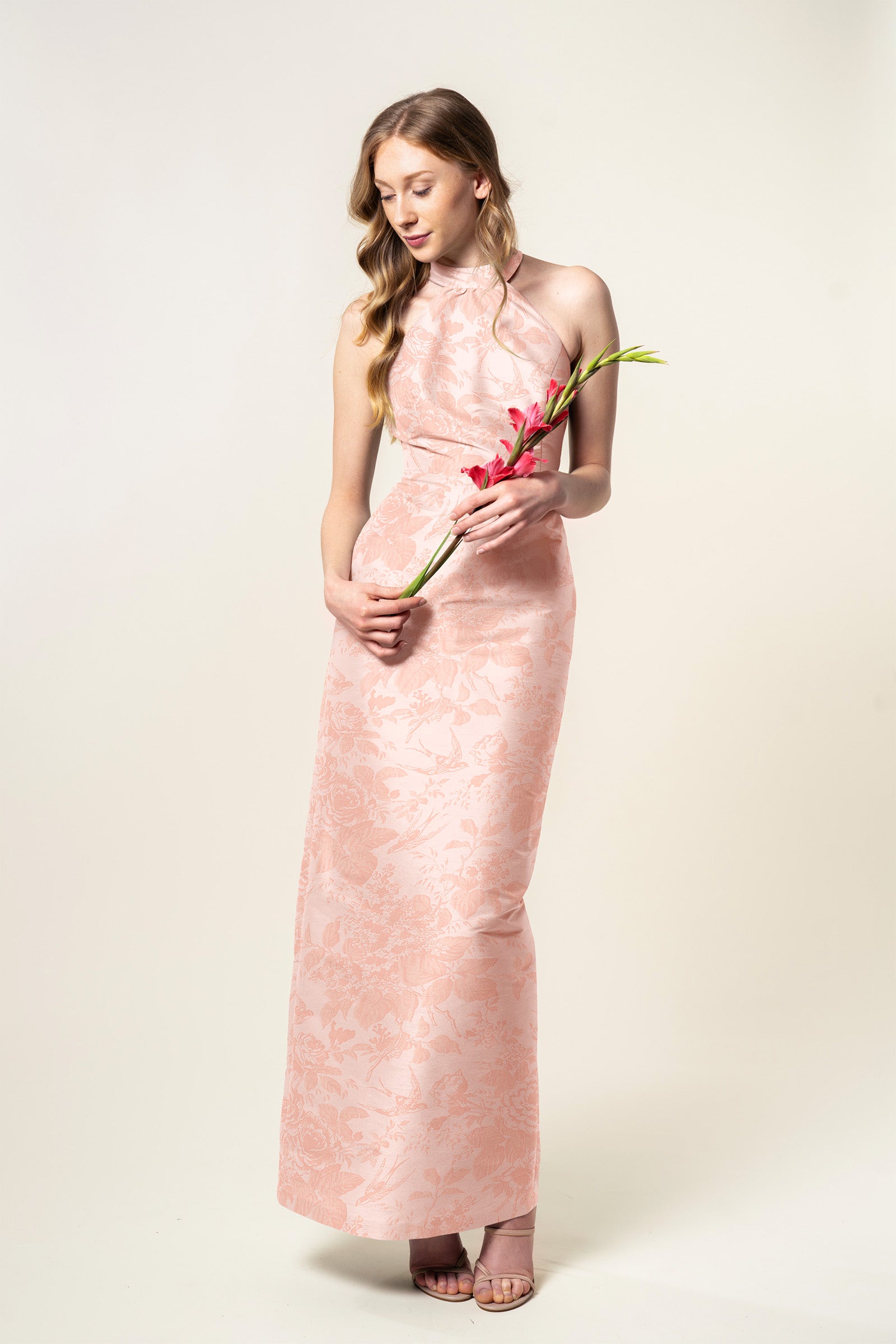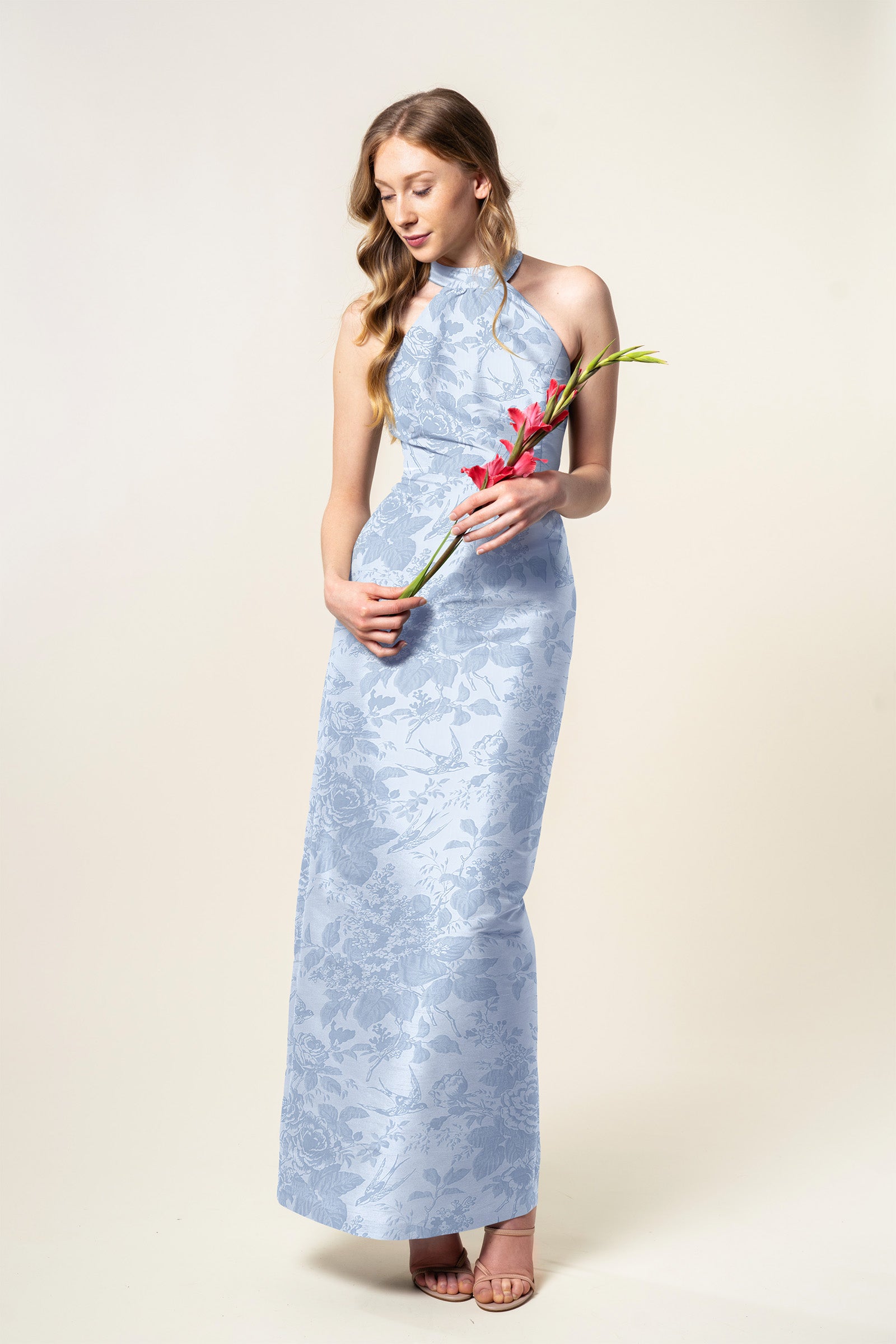 The Abby is a sleek, modern halter style neckline. She is nipped at the waist and gathered into a semi-standing collar, with a center back clasp and keyhole closure.