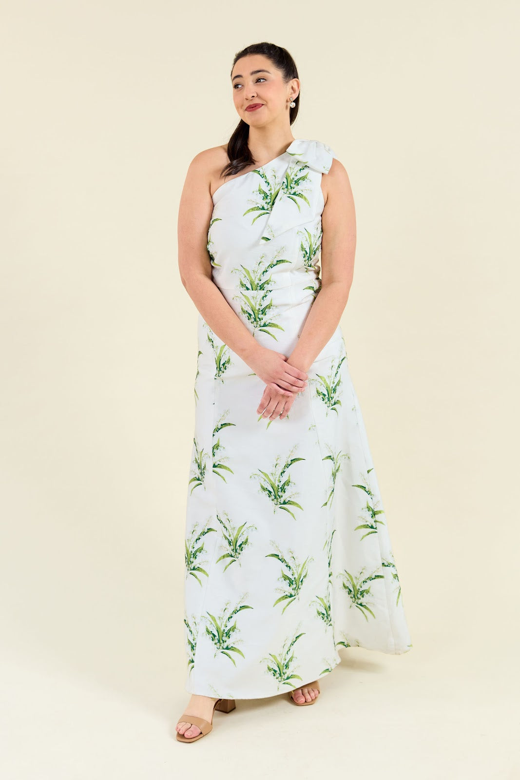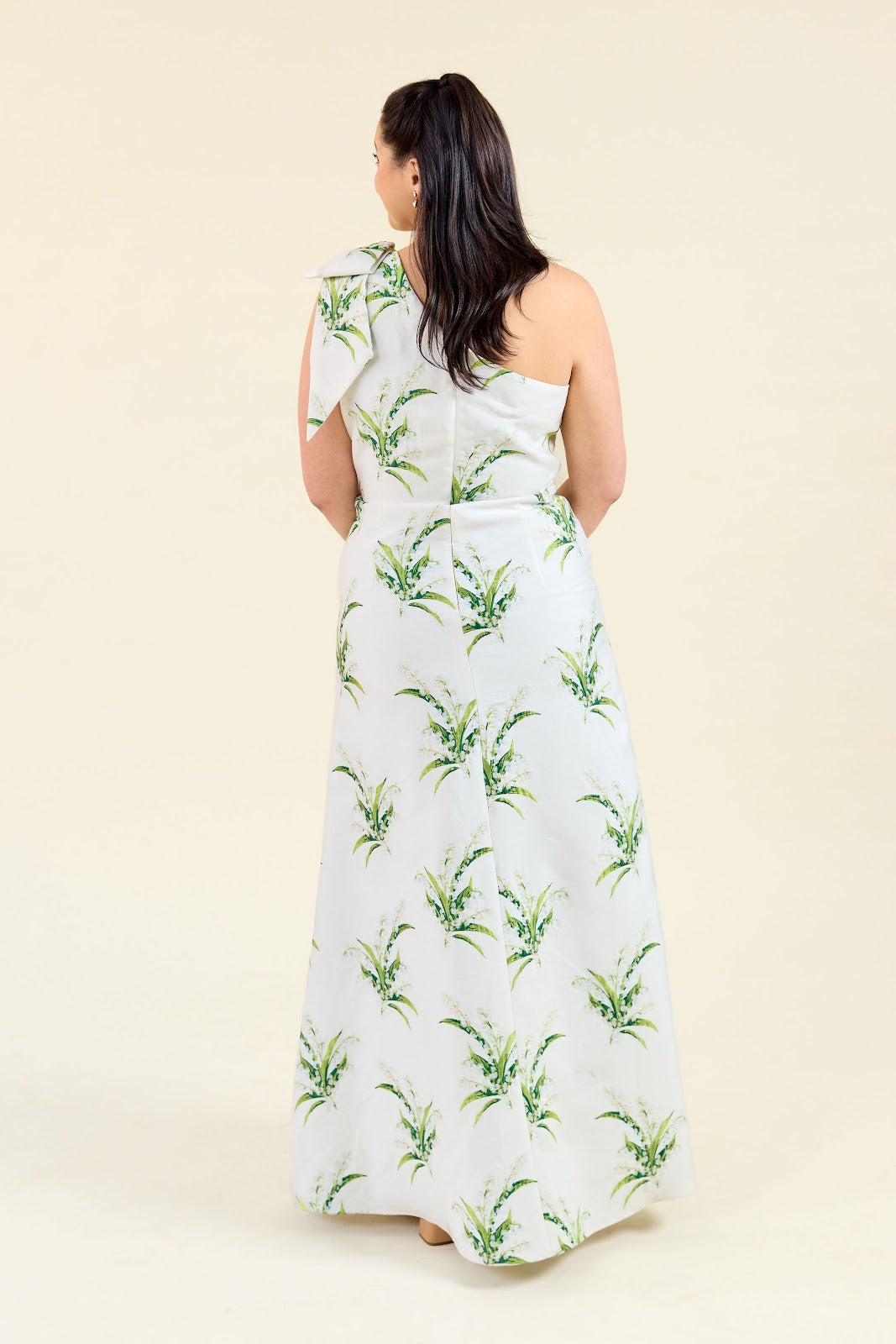 The Atwood Dress is a stunning one shoulder style featuring a luxe bow with trailing tails. Timeless, romantic, and feminine all at once.