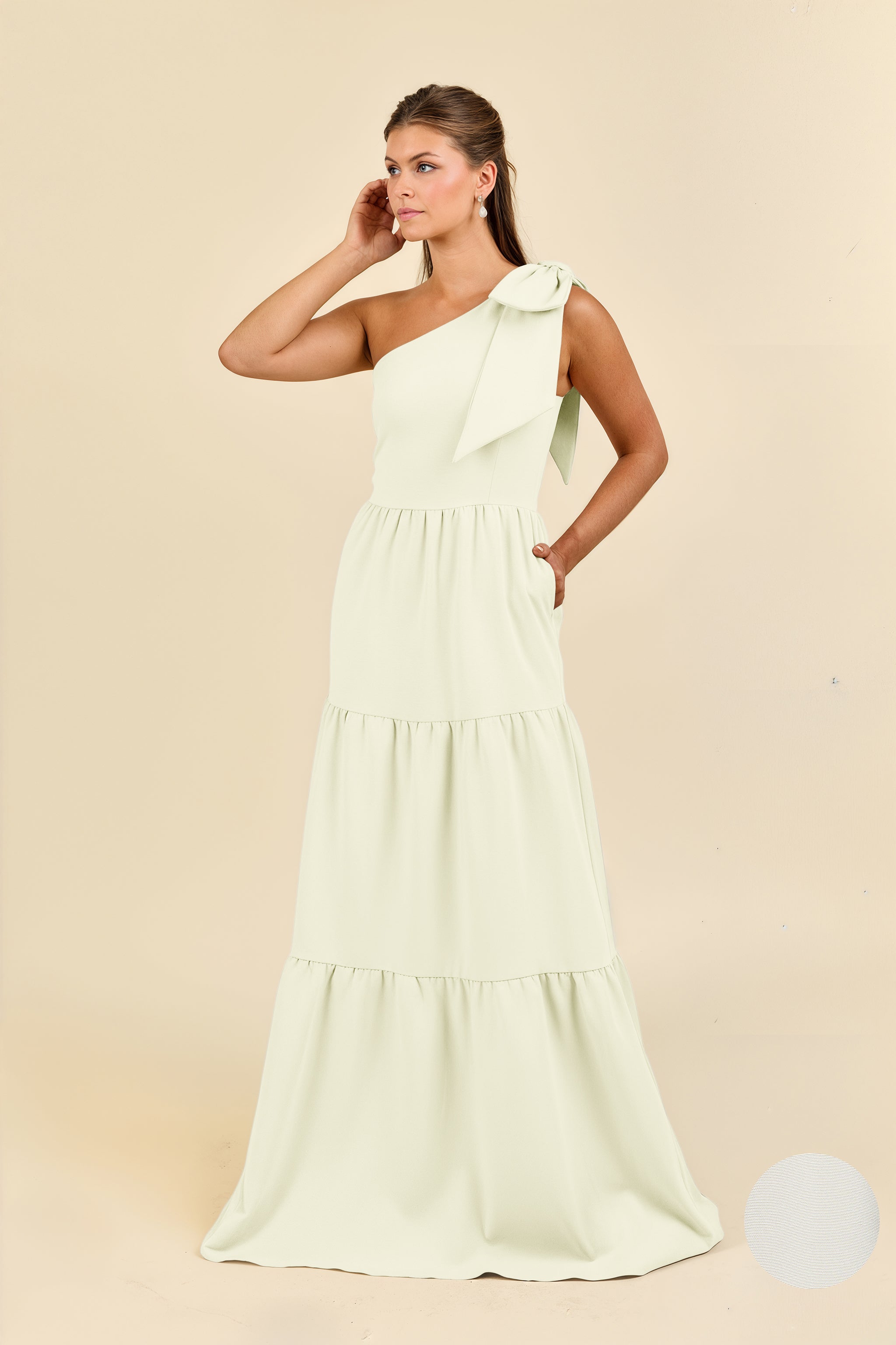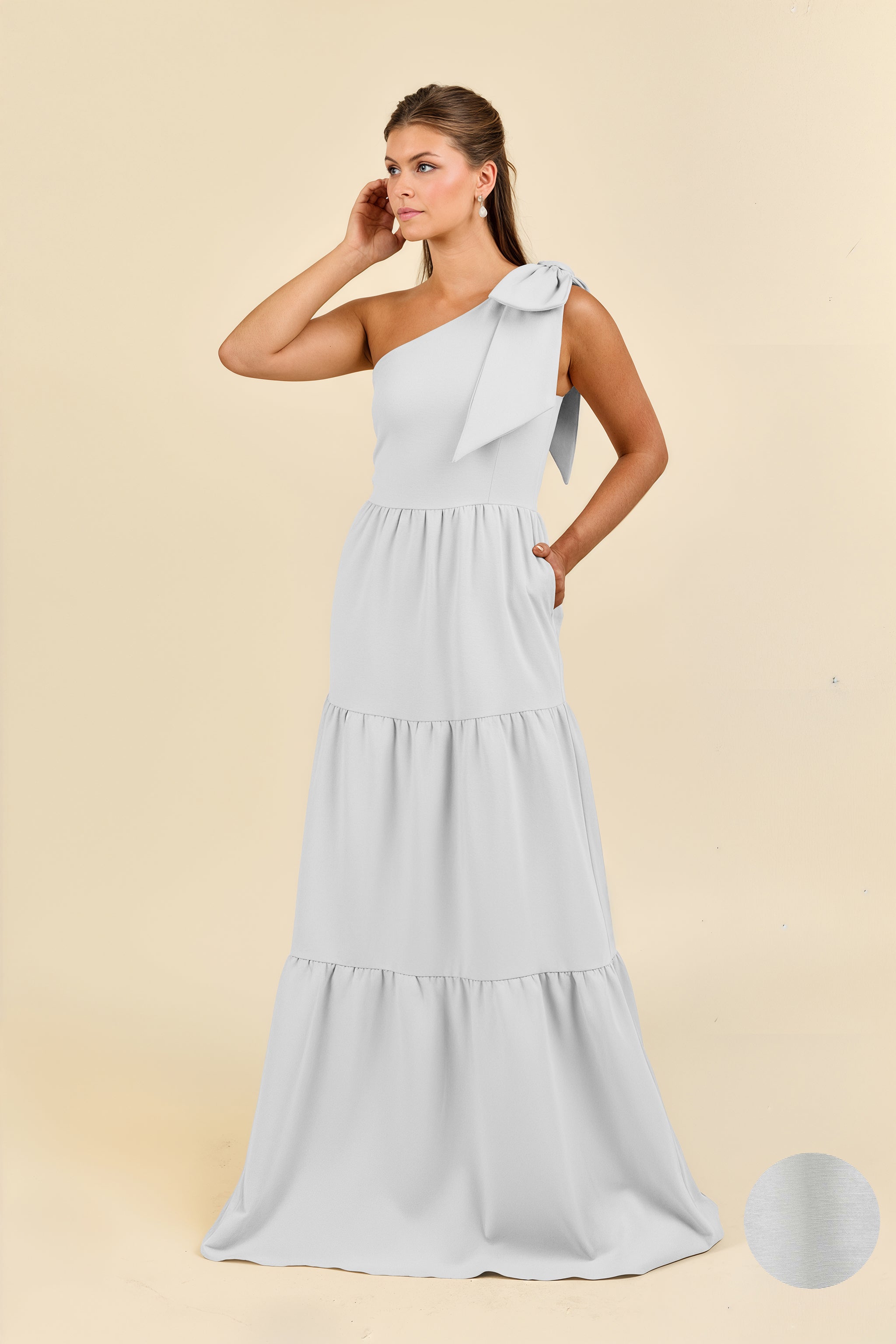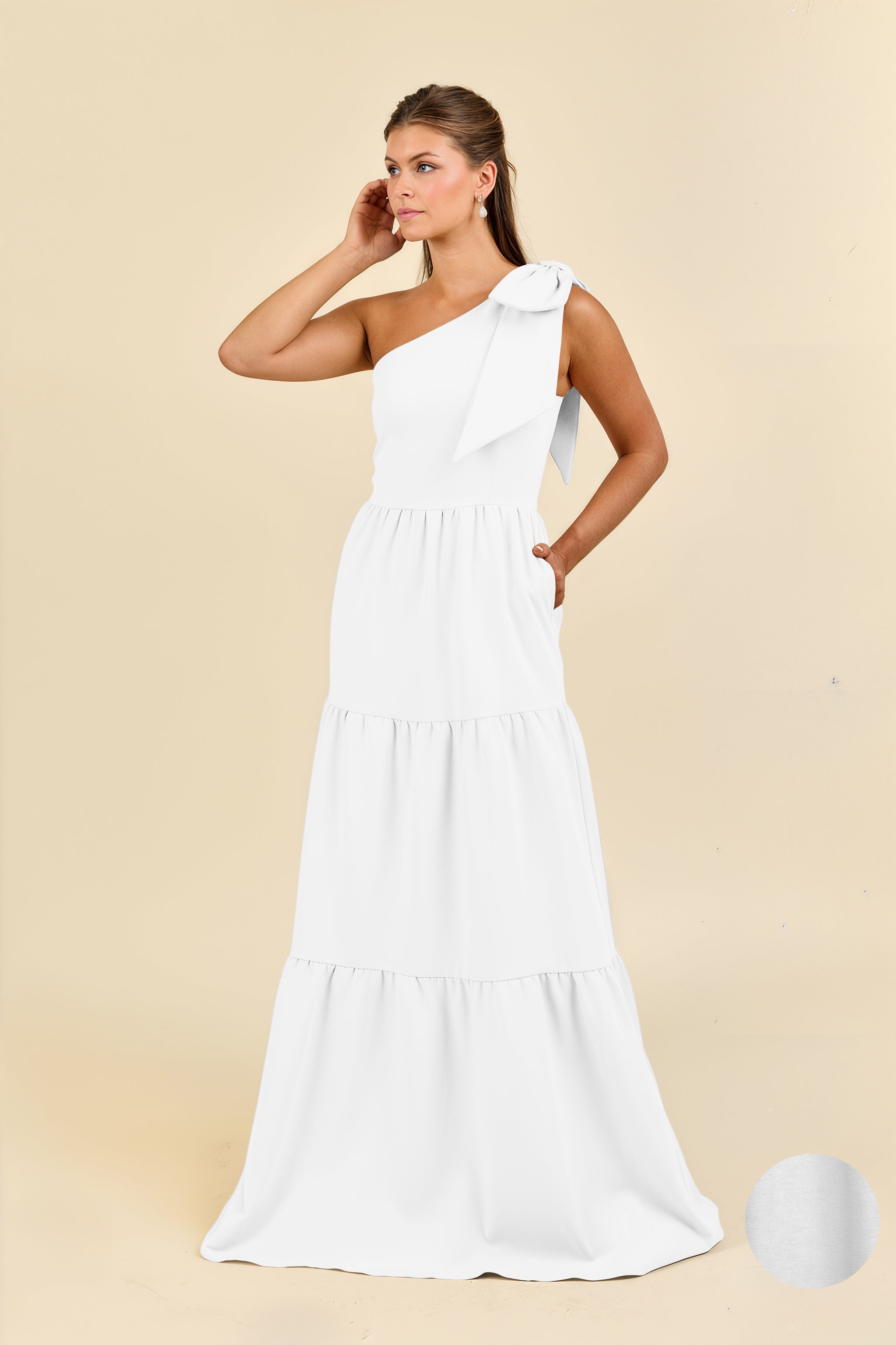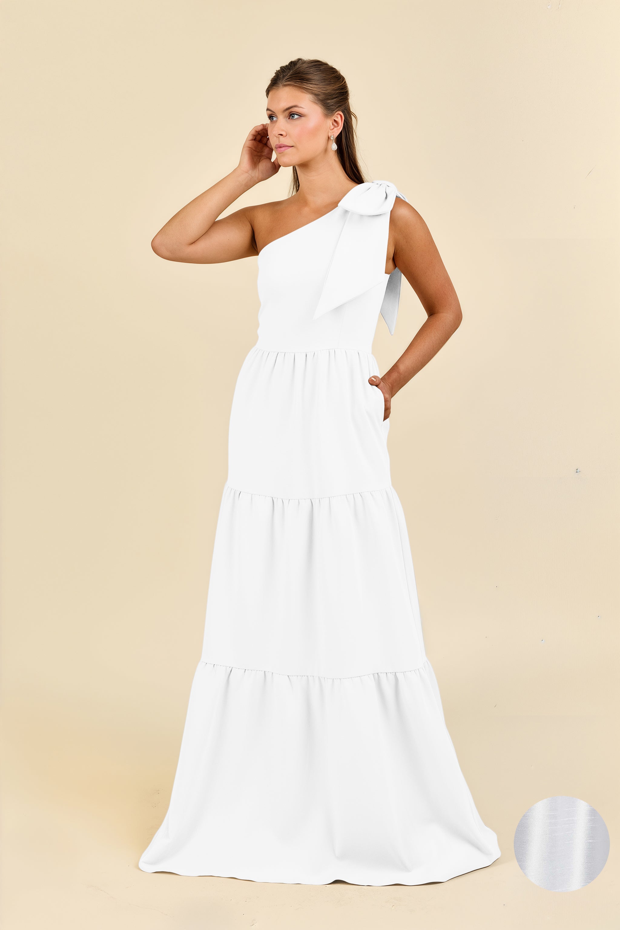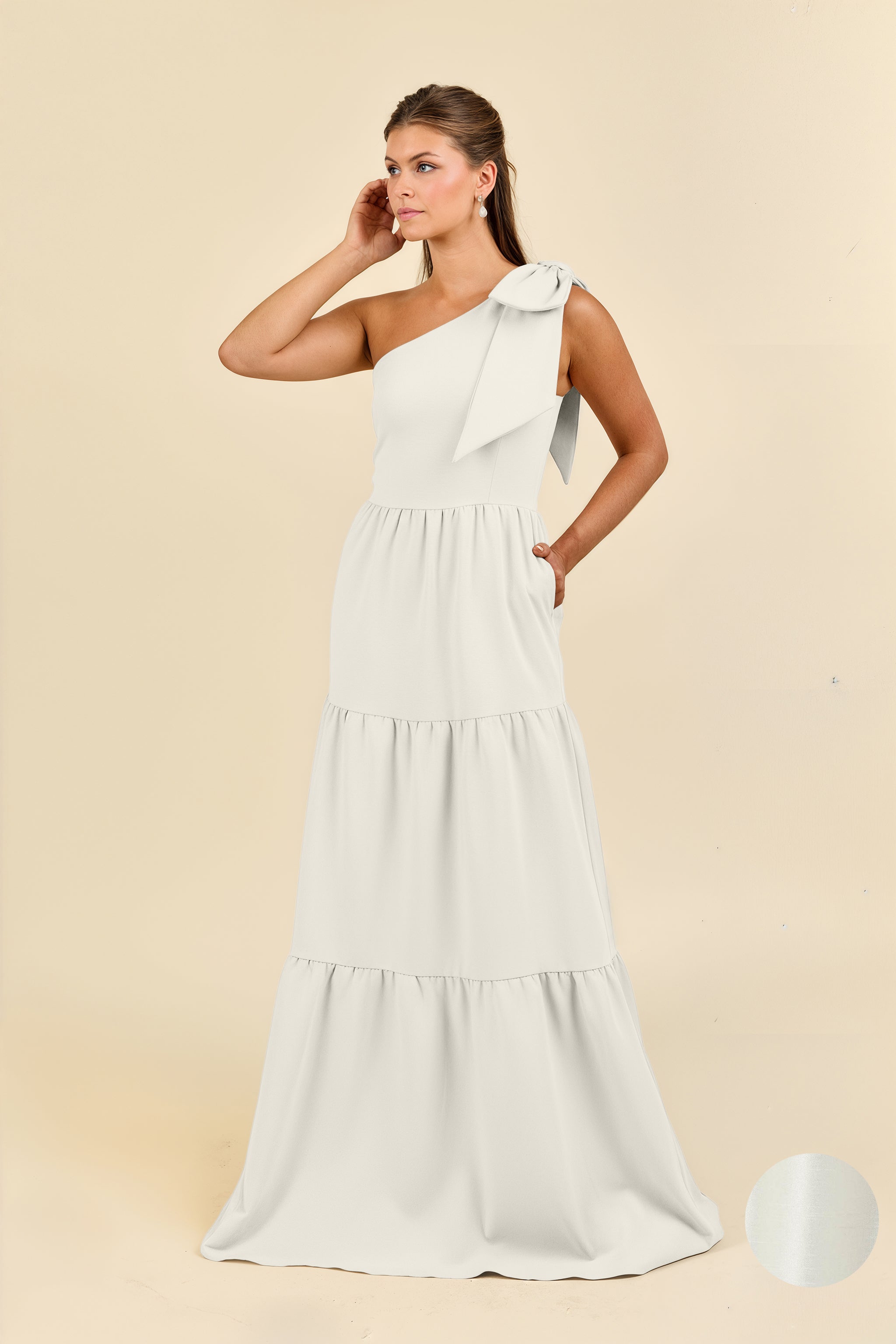 The Atwood Dress is a stunning one shoulder style featuring a luxe bow with trailing tails. Timeless, romantic, and feminine all at once.