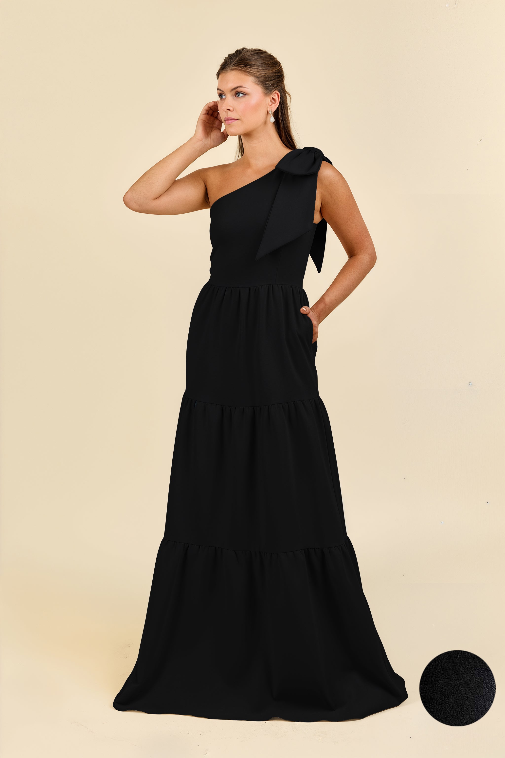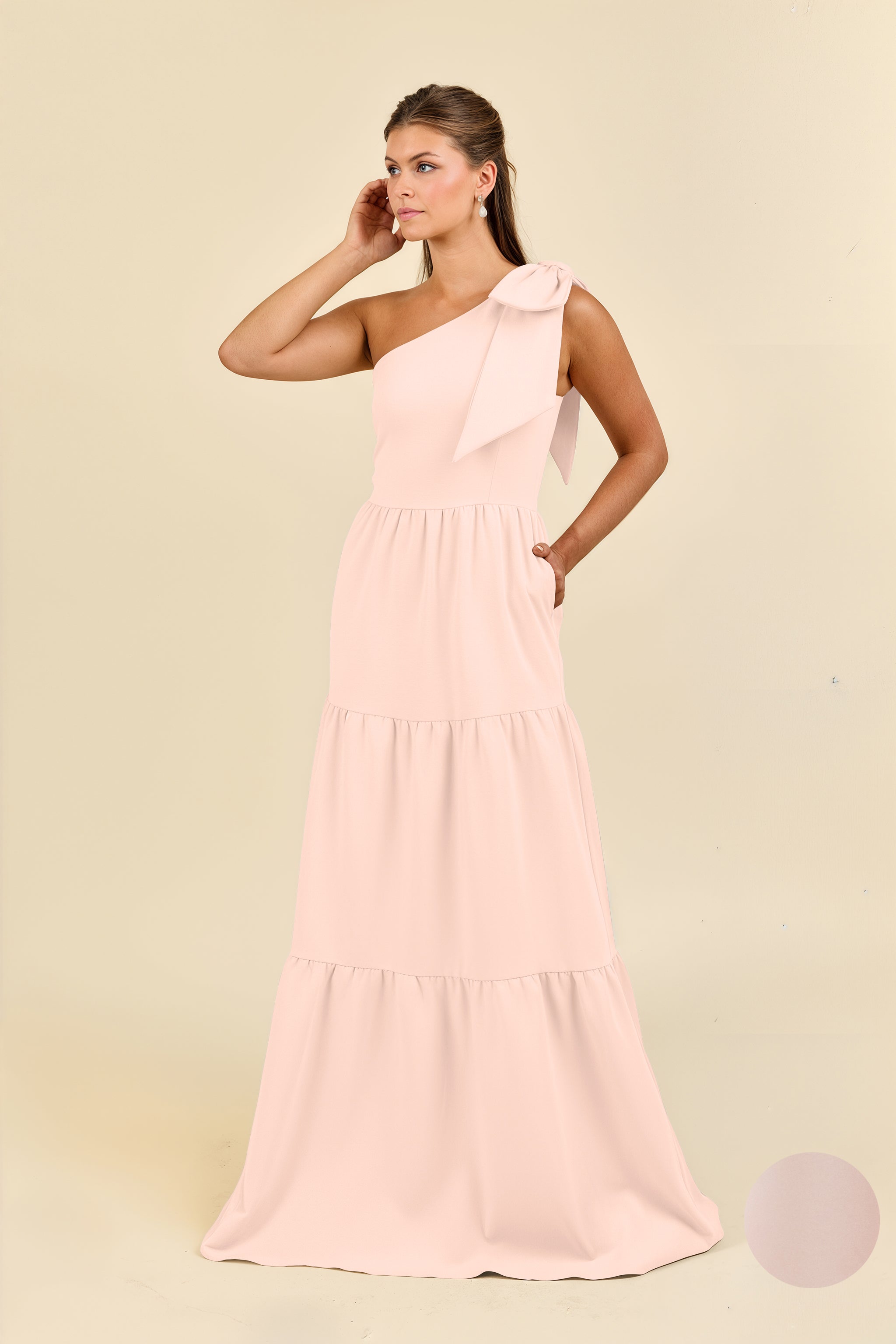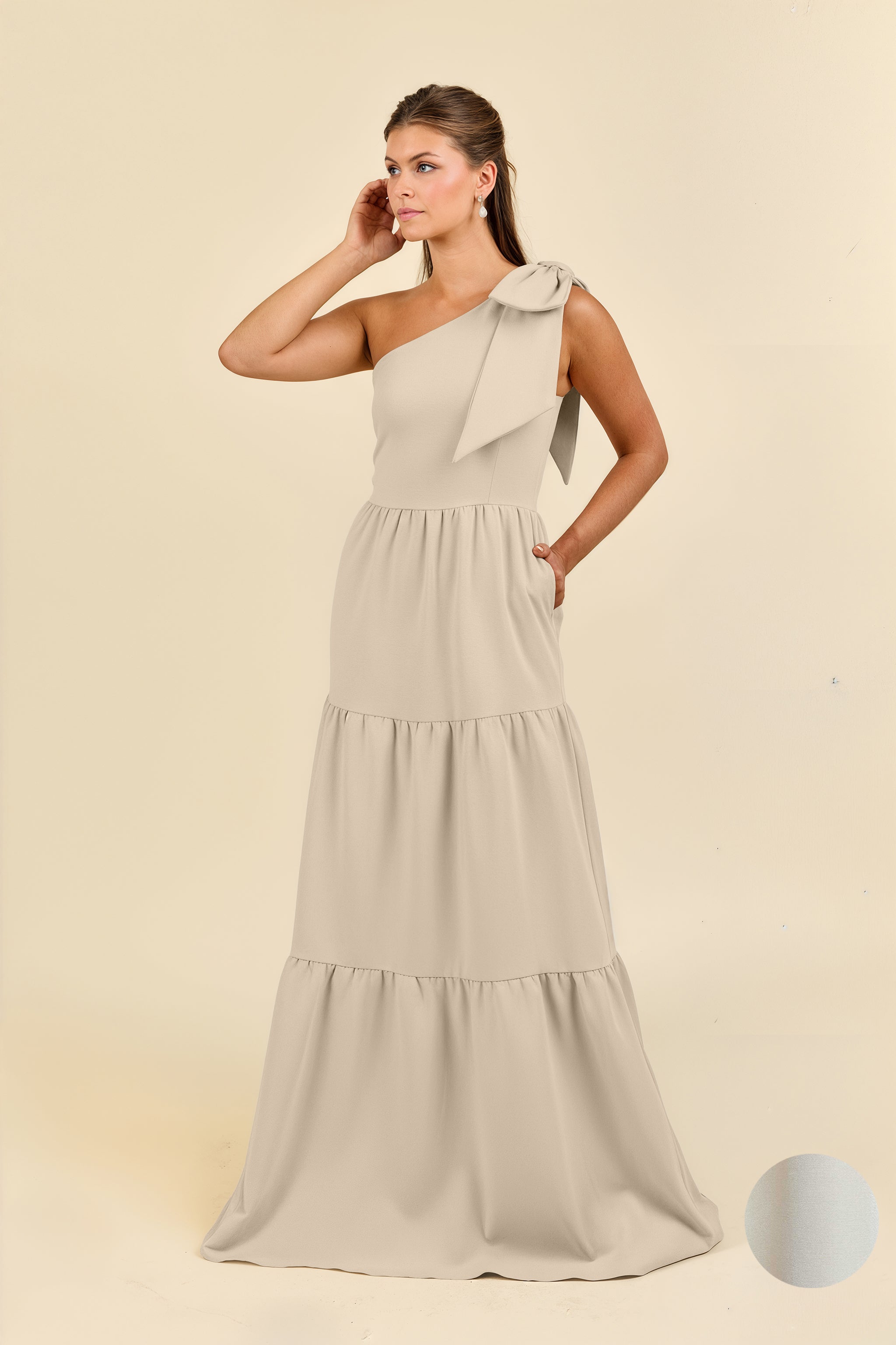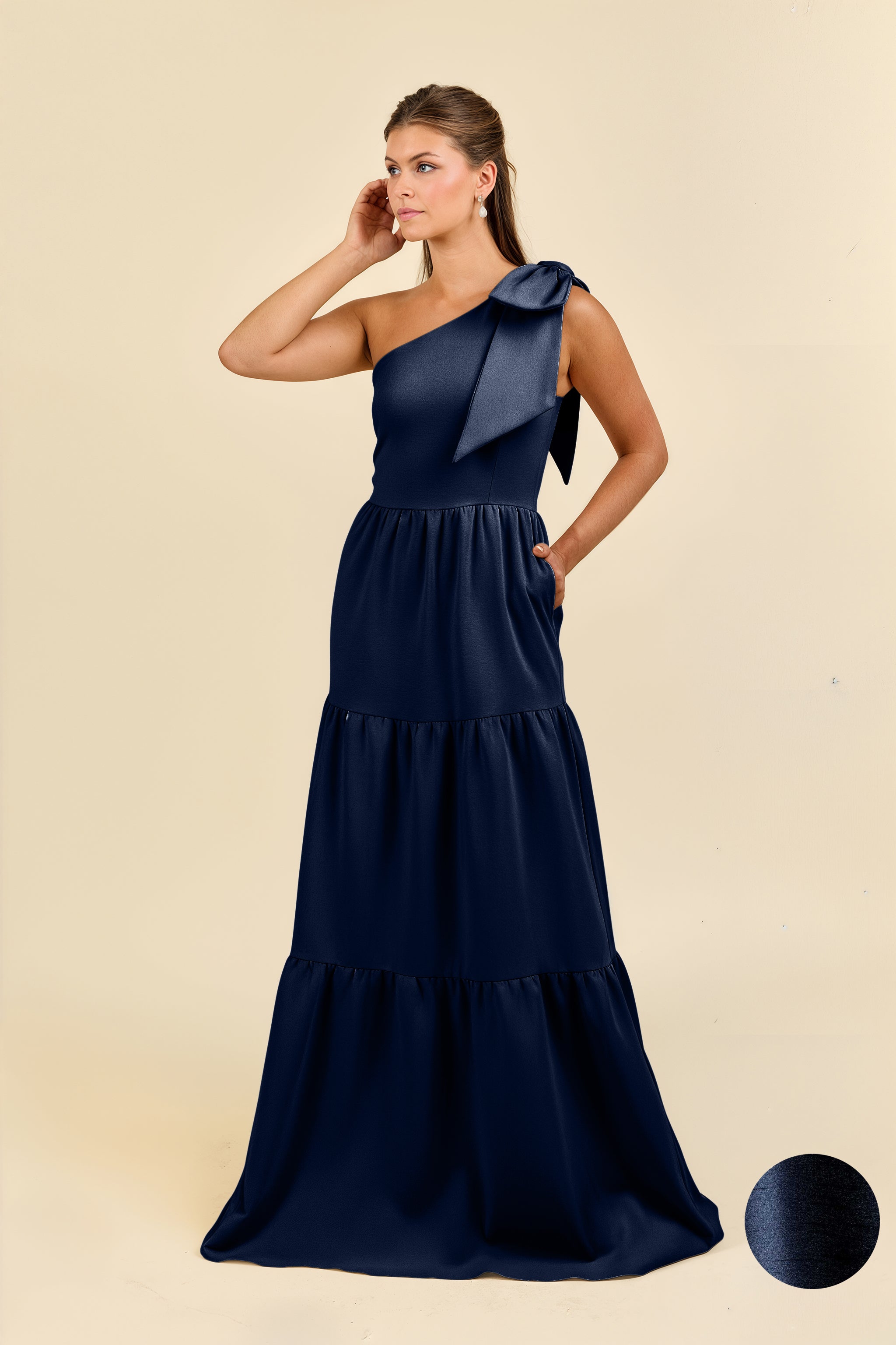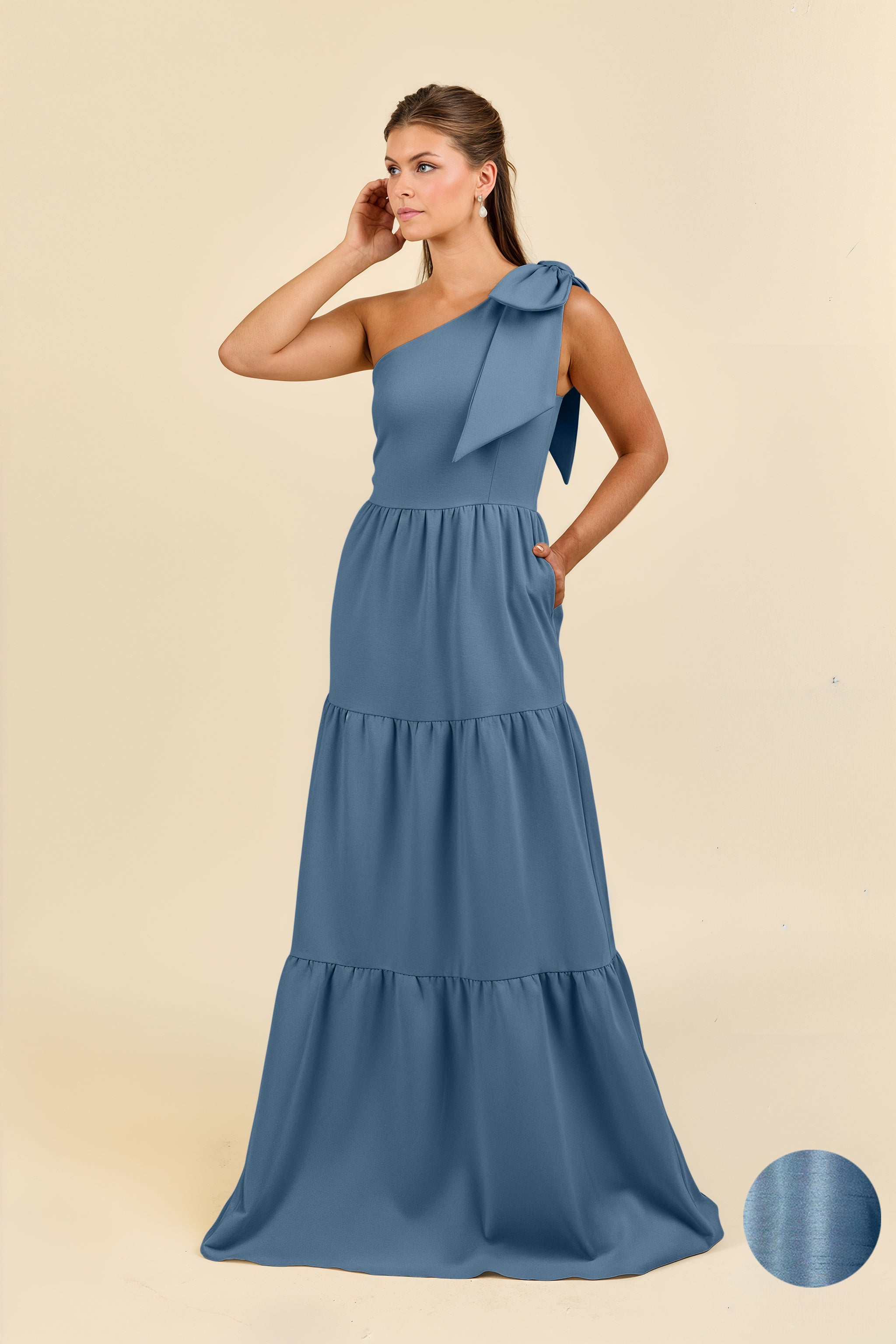 The Atwood Dress is a stunning one shoulder style featuring a luxe bow with trailing tails. Timeless, romantic, and feminine all at once.
