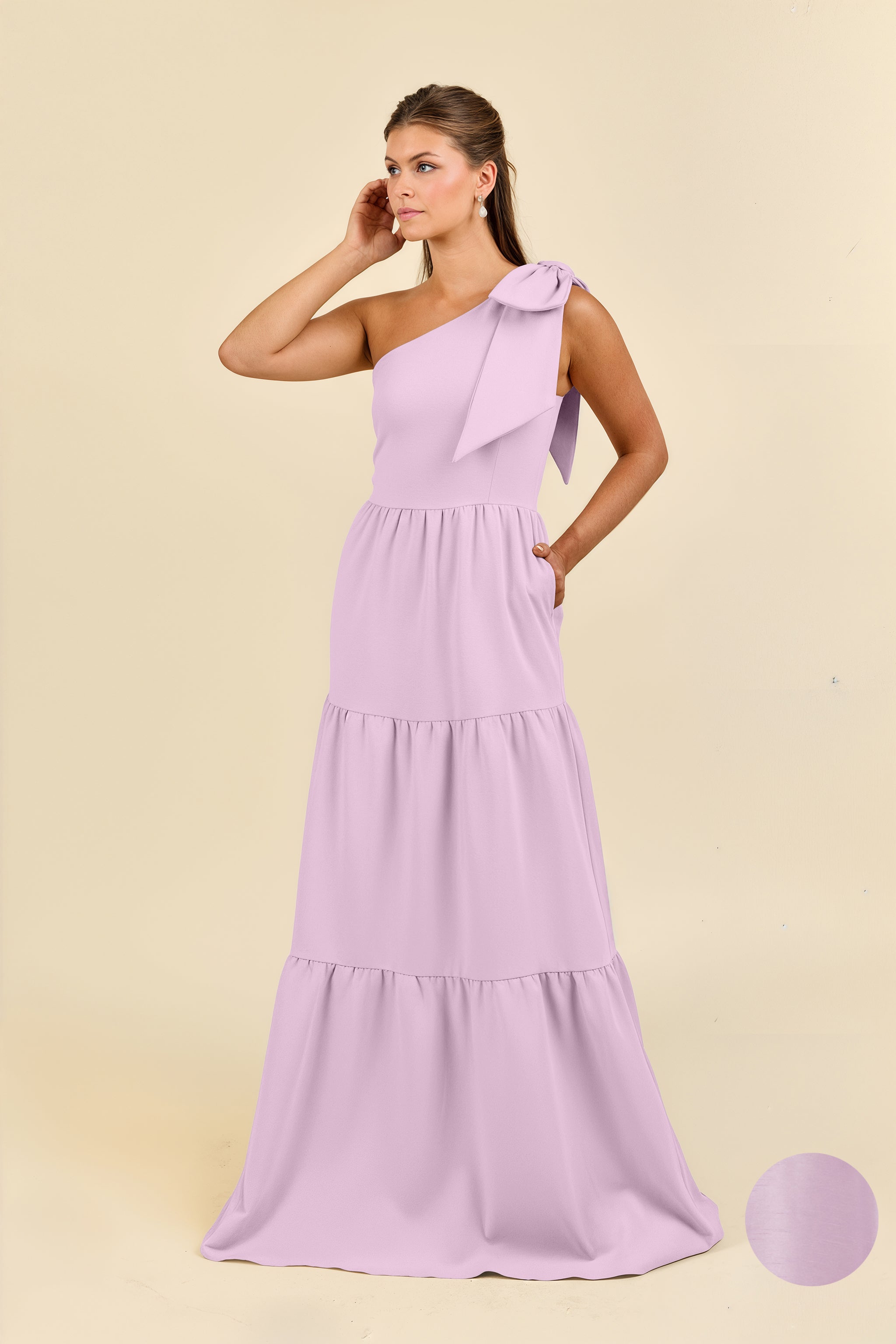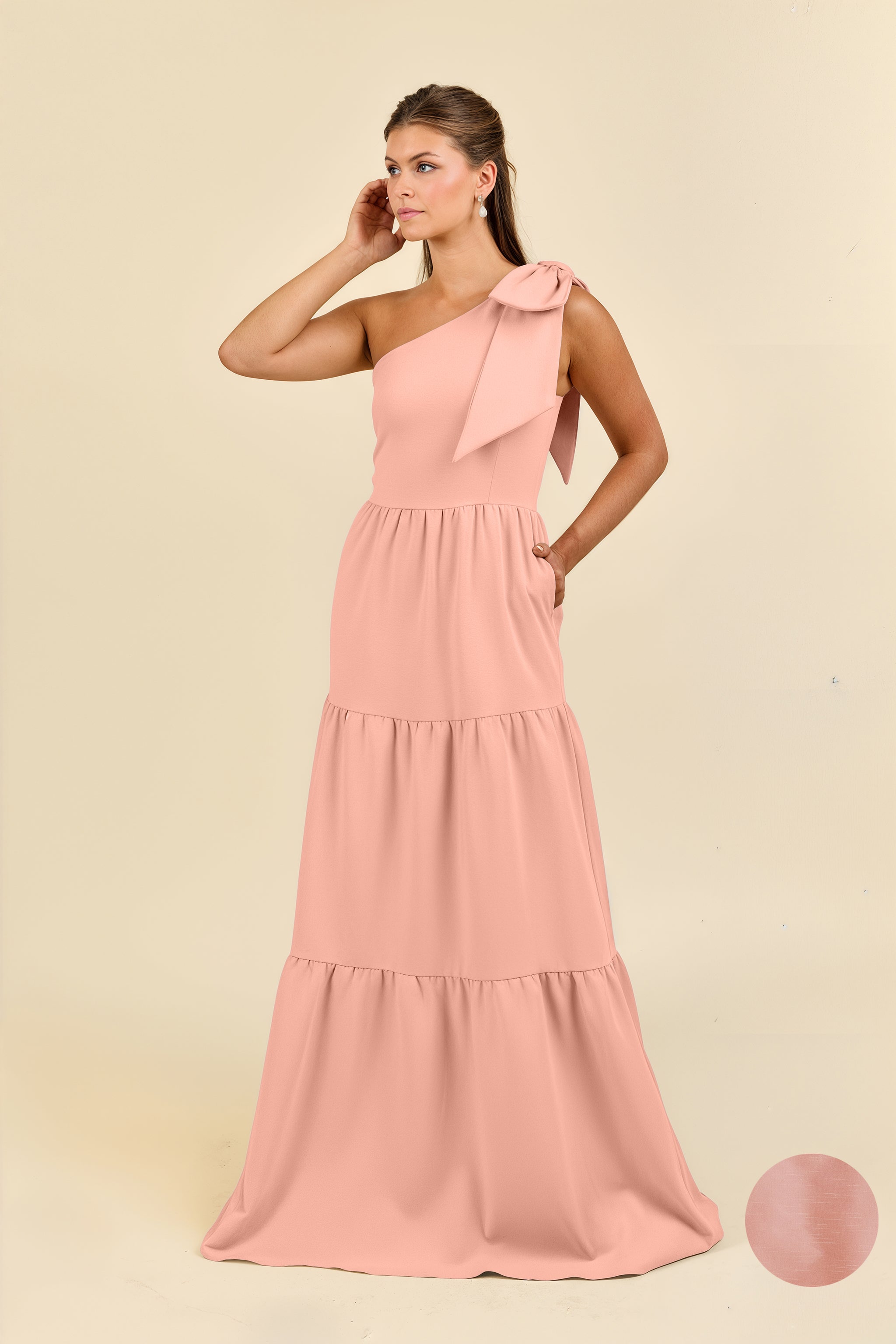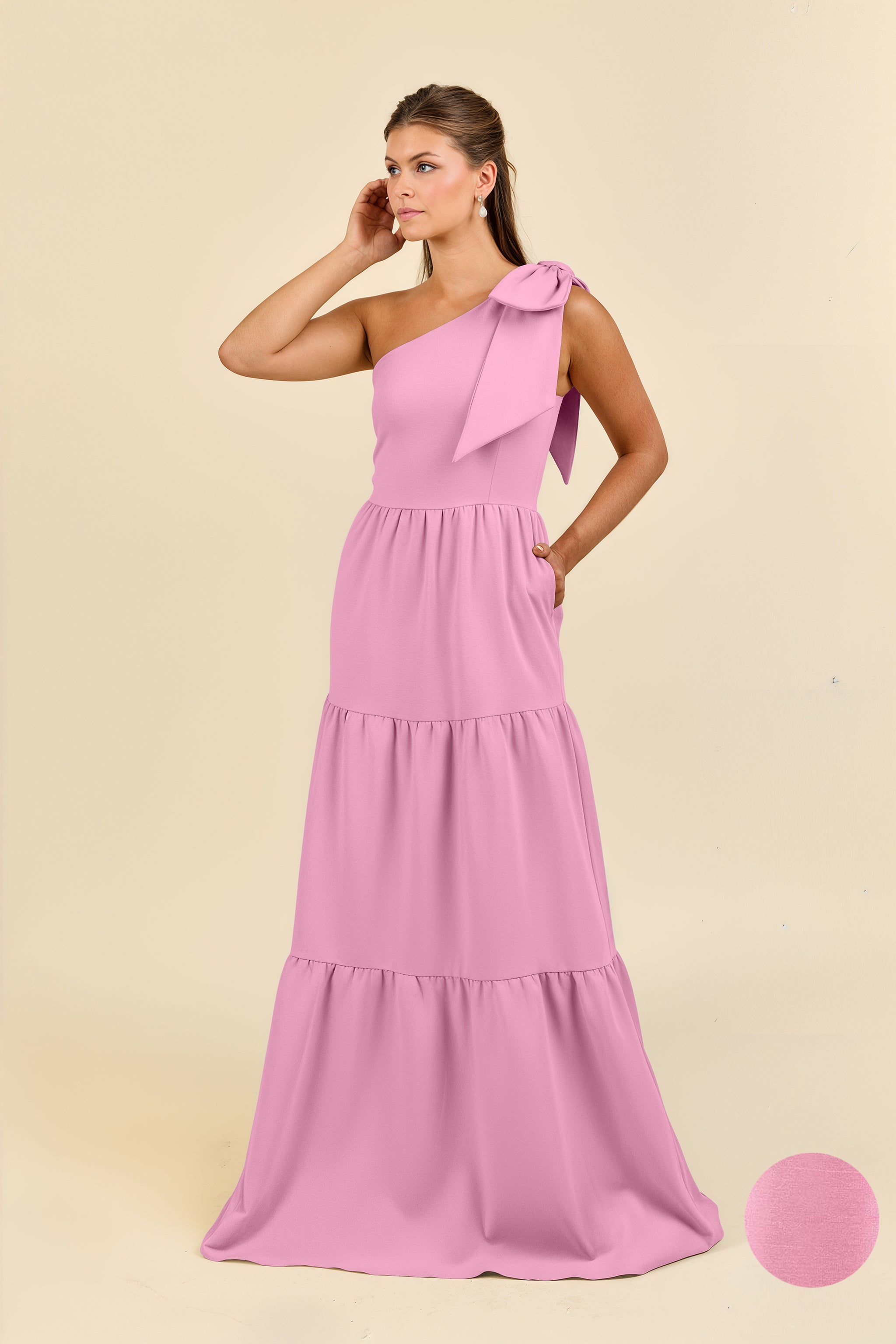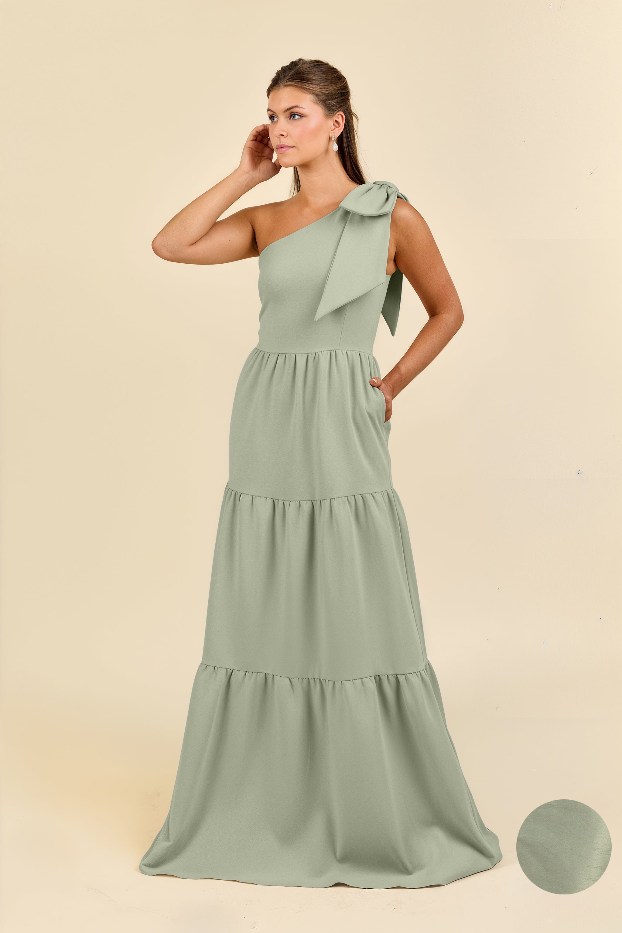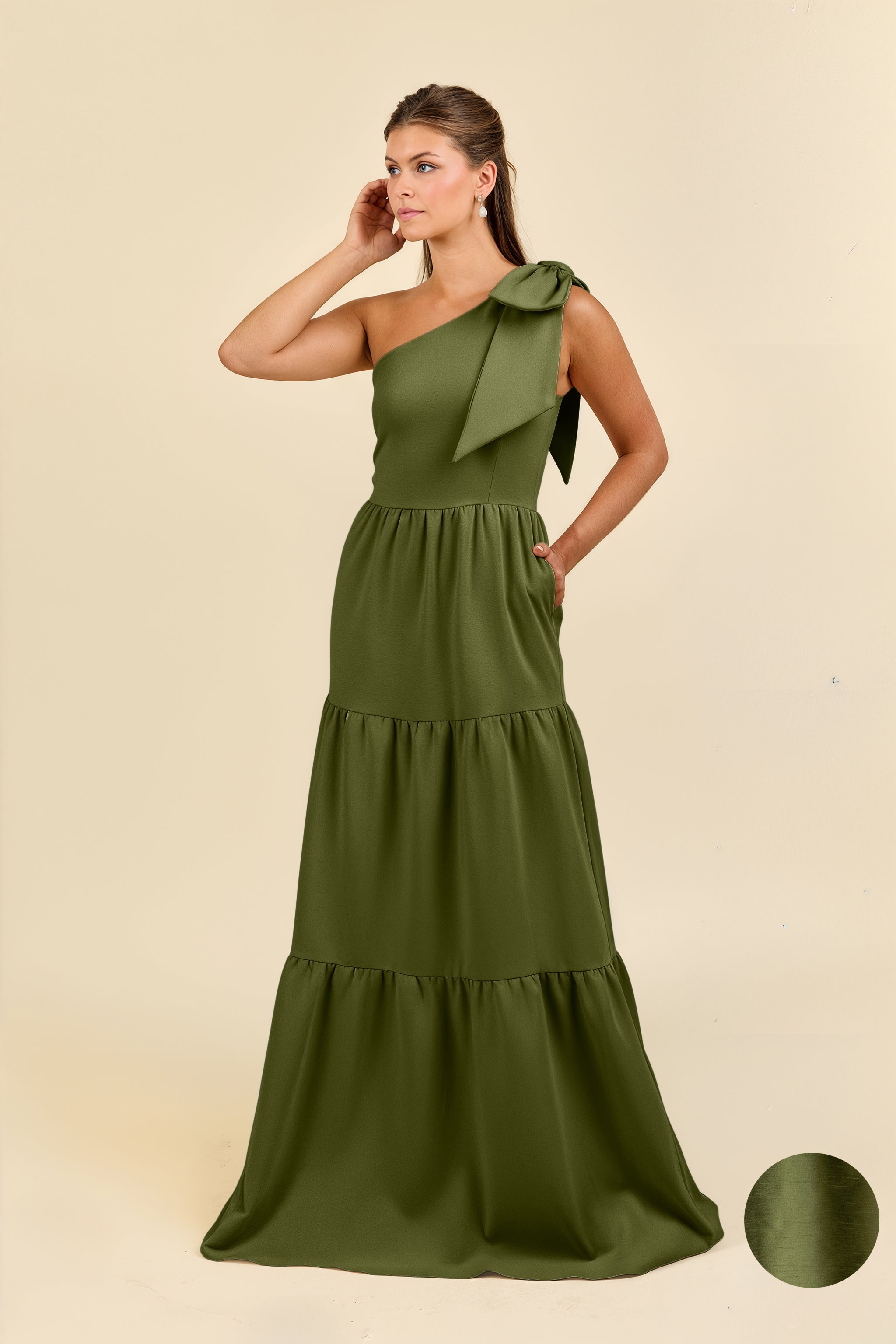 The Atwood Dress is a stunning one shoulder style featuring a luxe bow with trailing tails. Timeless, romantic, and feminine all at once.