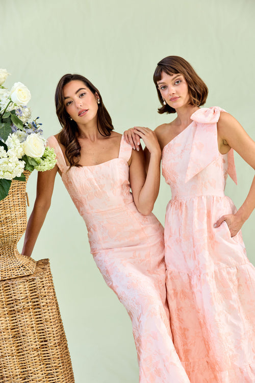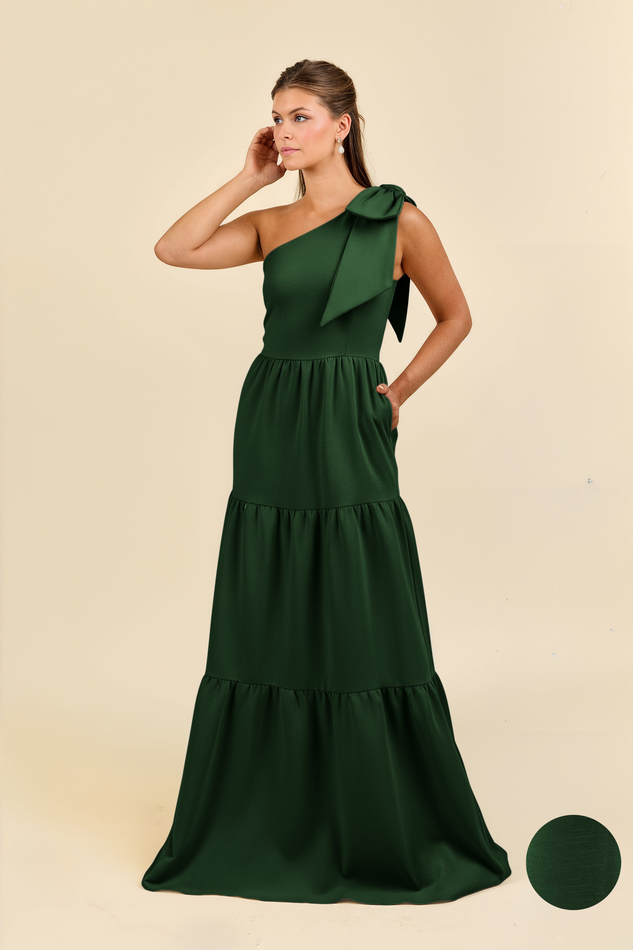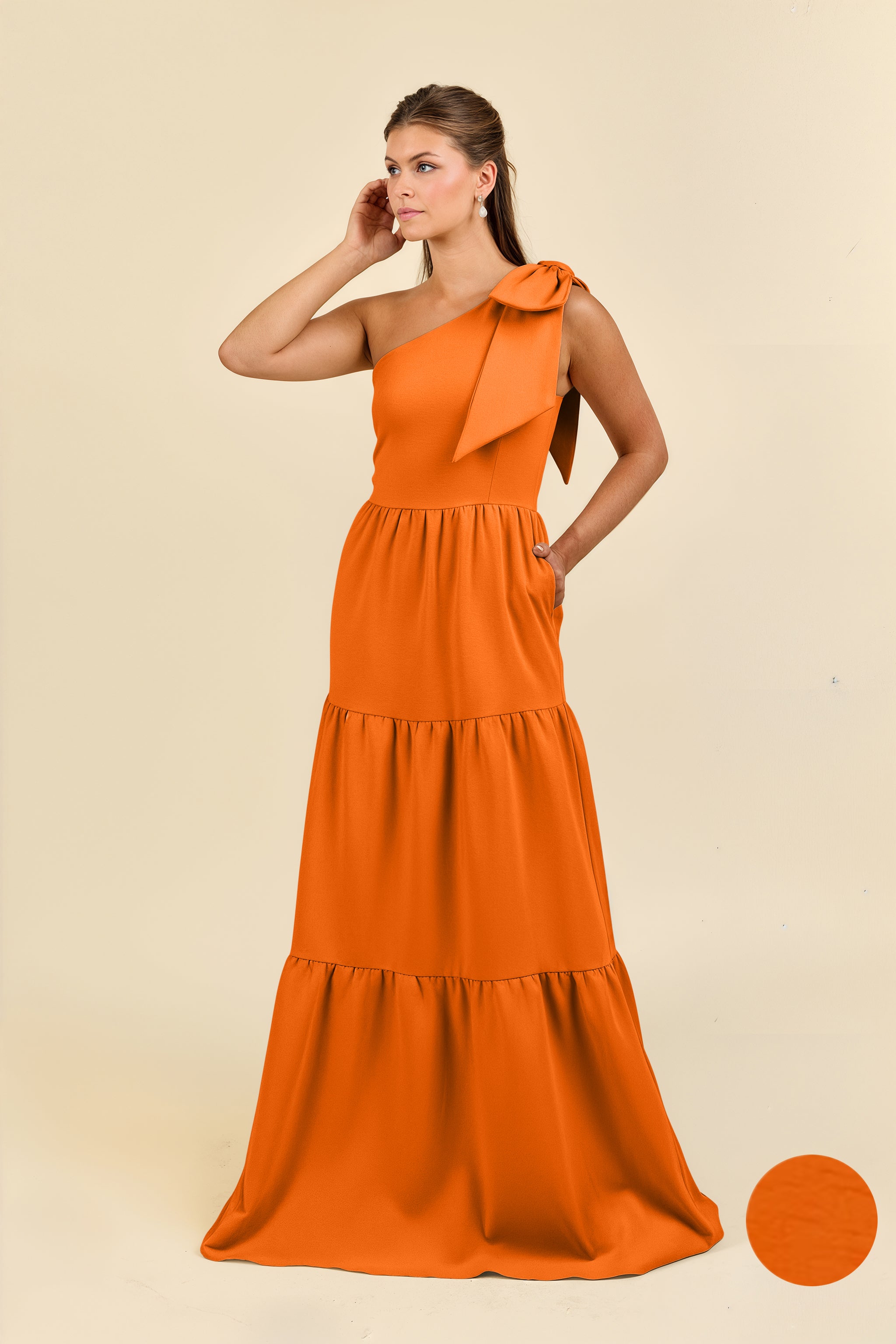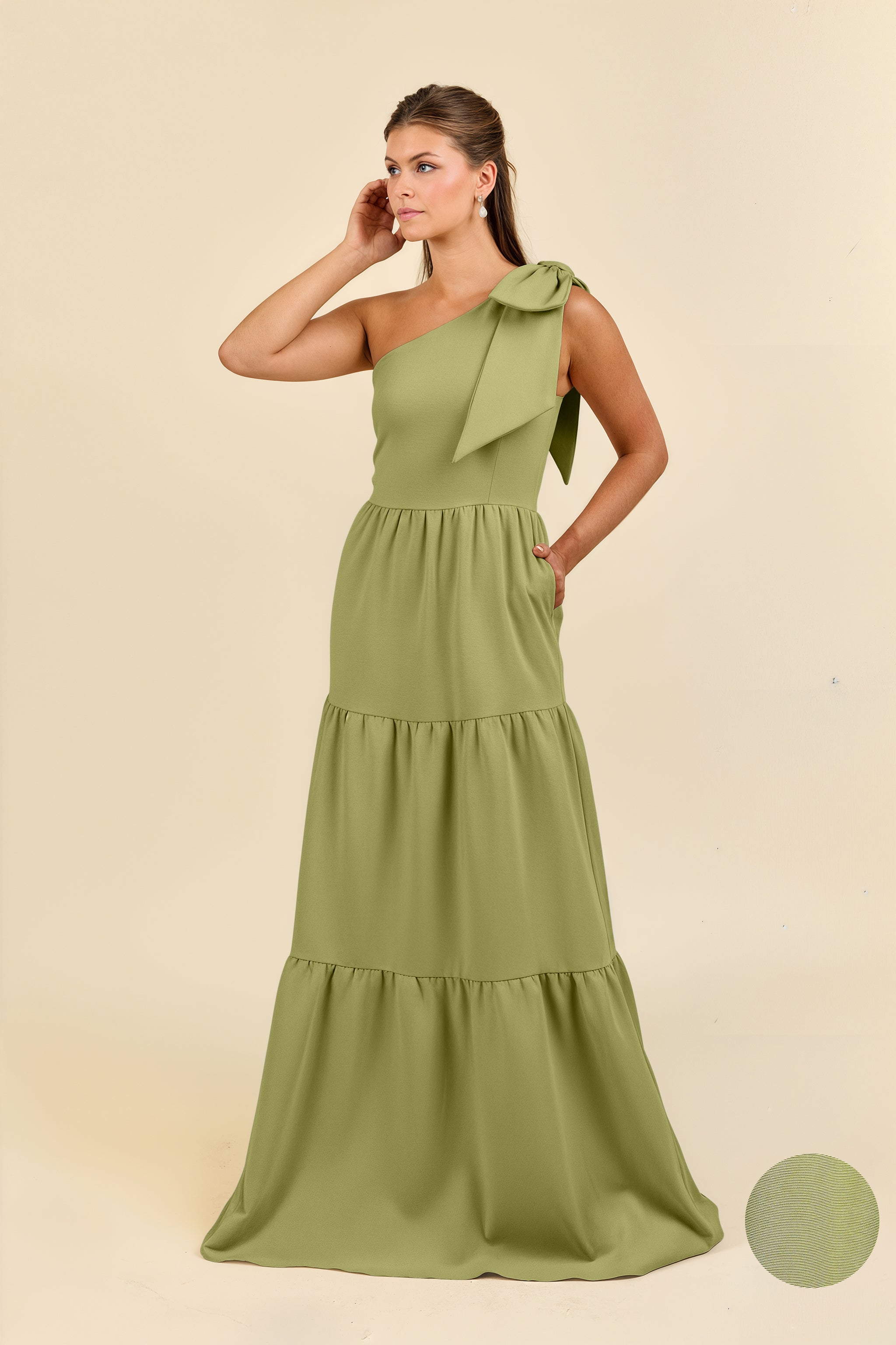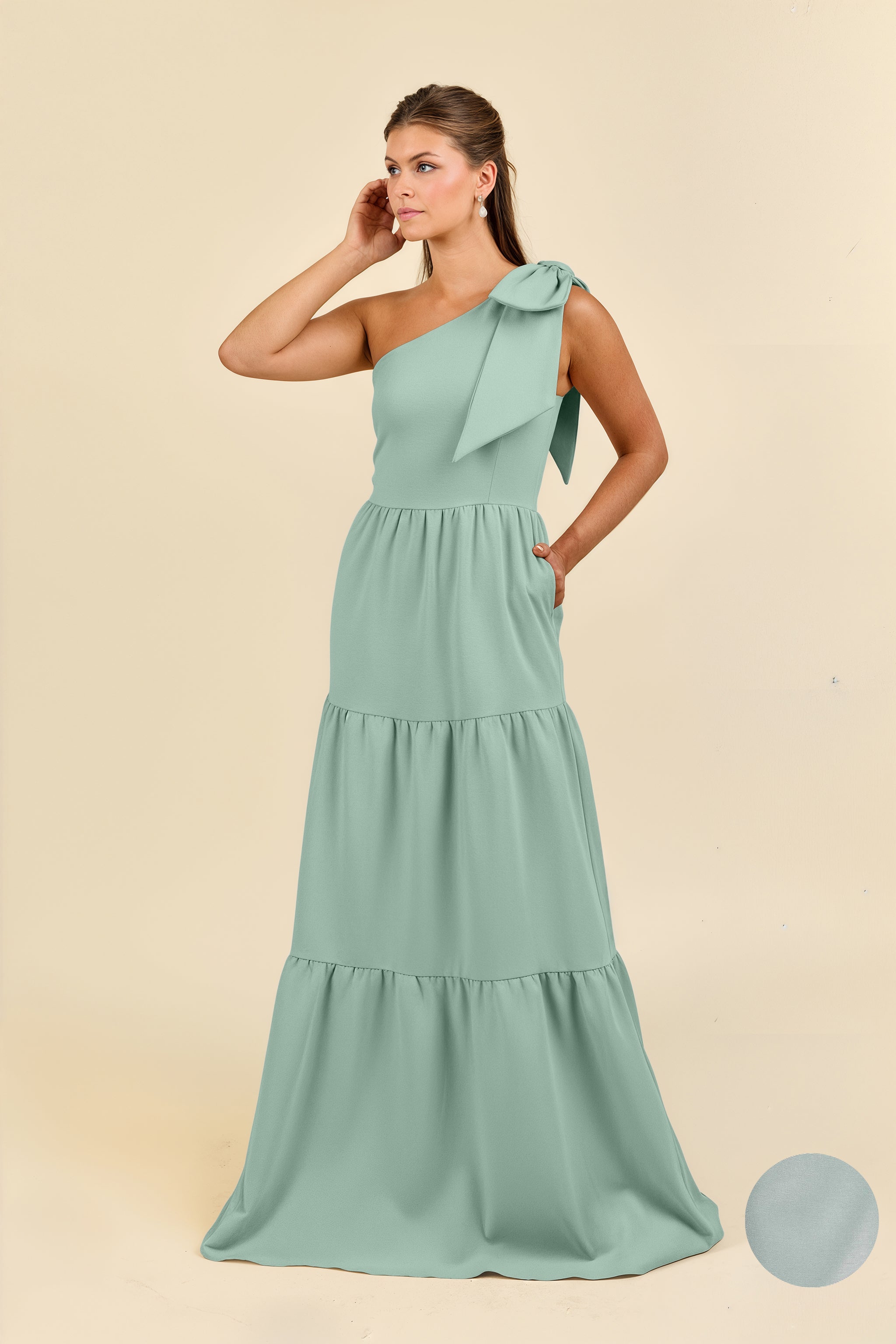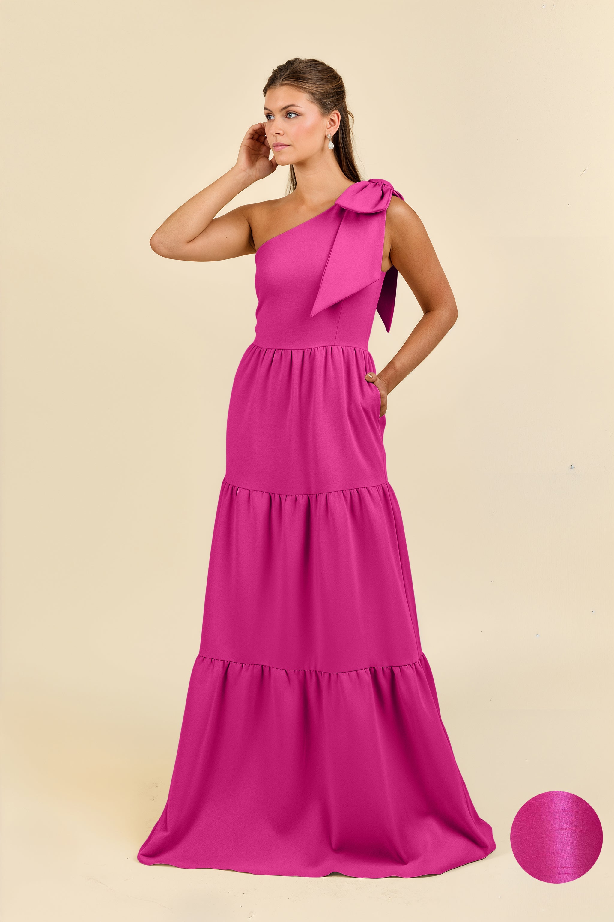 The Atwood Dress is a stunning one shoulder style featuring a luxe bow with trailing tails. Timeless, romantic, and feminine all at once.