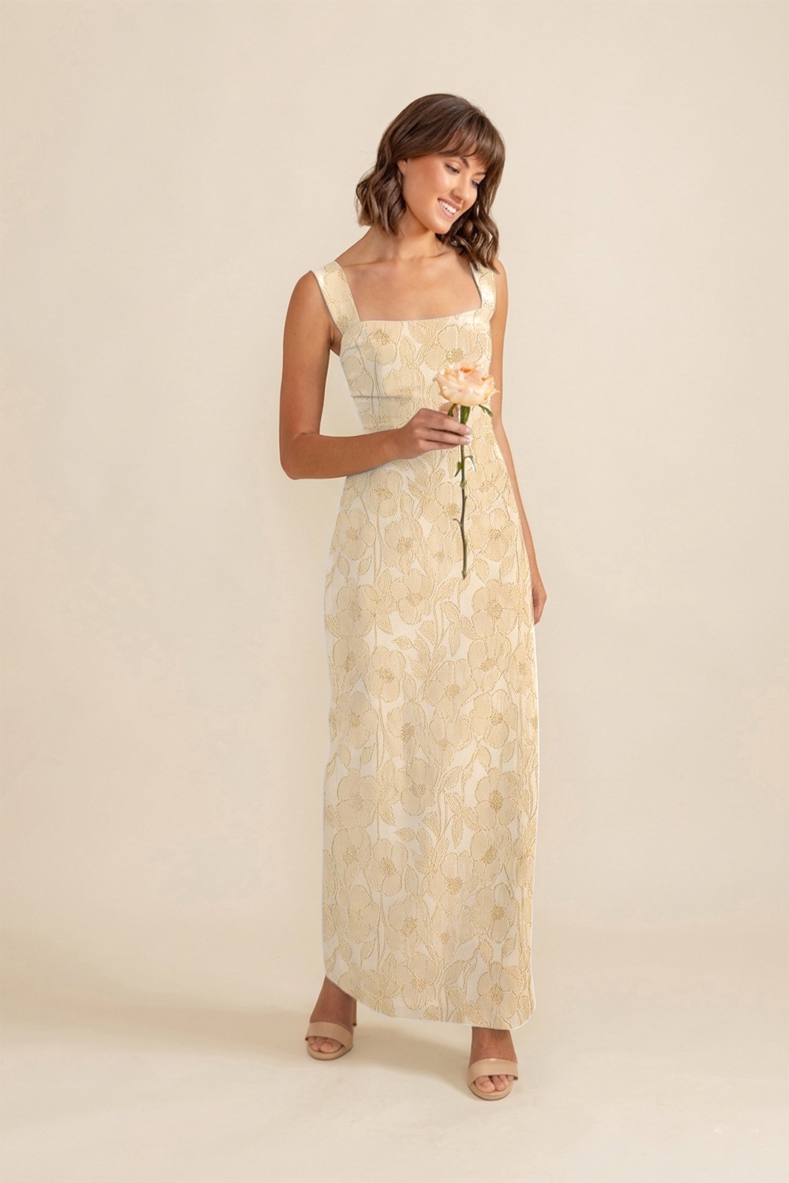 Our Beckett Dress is a customer favorite. Featuring wide straps, princess seams, and a slightly scooped neckline, this style is a modern classic. Shown with the Straight Skirt.