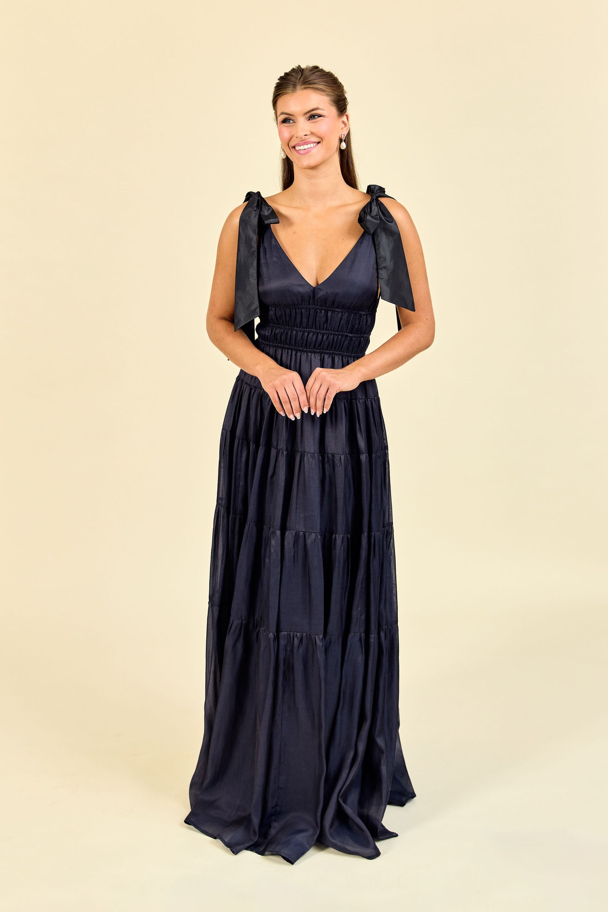 Ready-to-Ship. Introducing our Demi Dress, a stunning style with taffeta shoulder ties and an elasticized bodice for effortless comfort. Its full, tiered skirt offers graceful movement and creates a beautifully romantic, elegant silhouette.