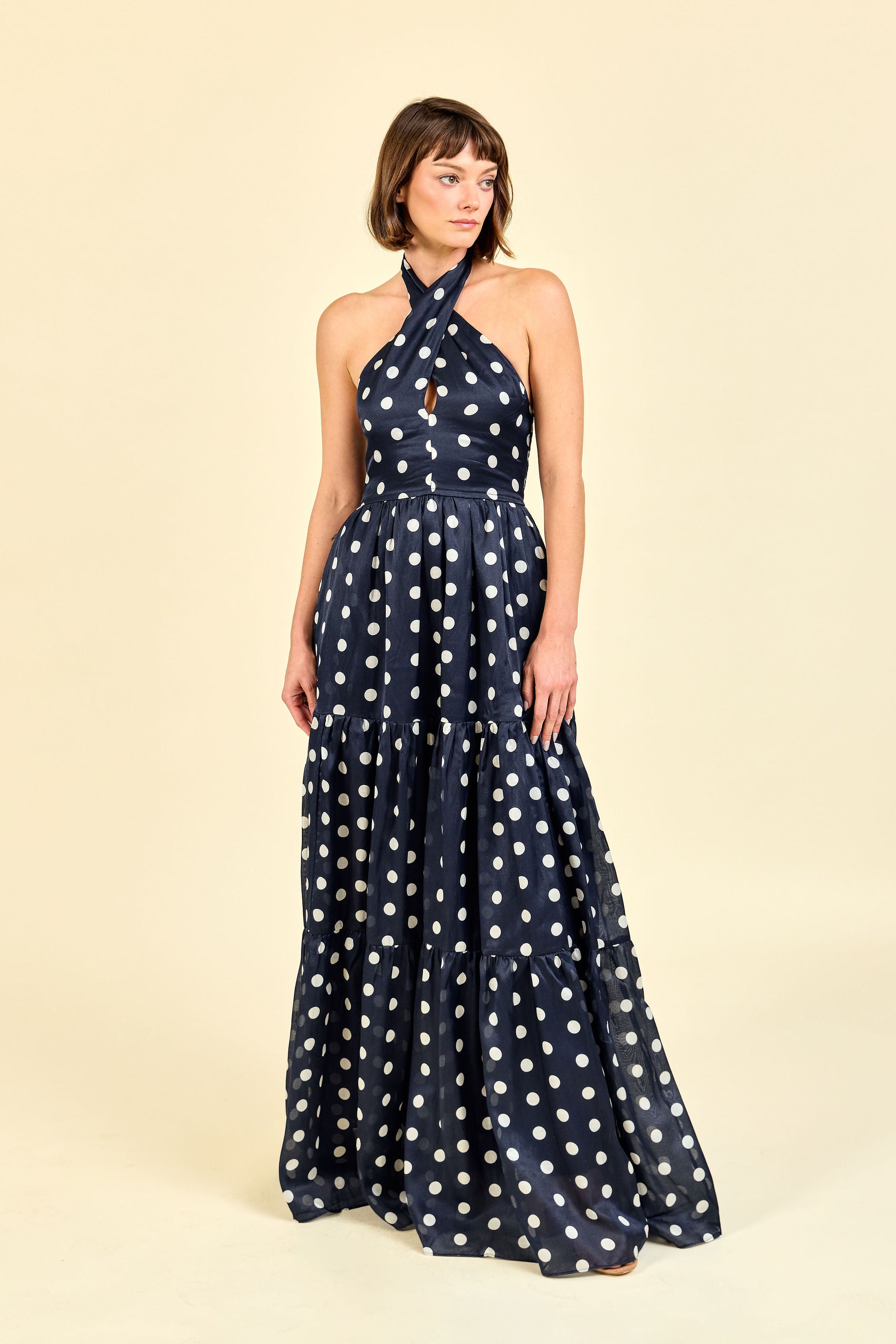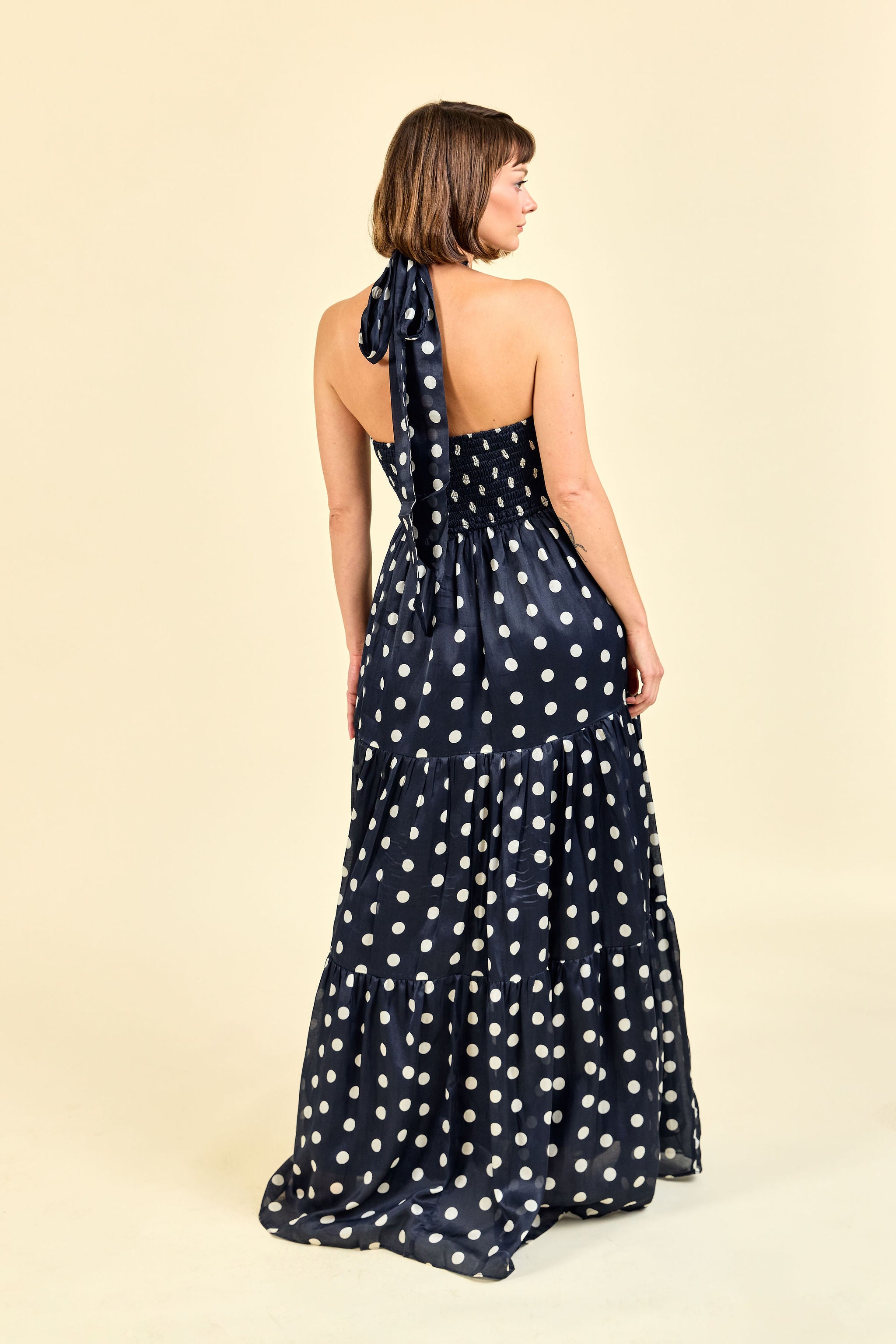 Ready-to-Ship. The Eden Dress features a stylish front halter neckline and a smocked back for a flattering, adjustable fit. It includes practical pockets and a full, flowing skirt that adds a touch of elegance and breezy movement.