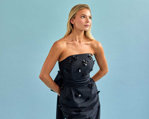 We love the streamlined, timeless silhouette of the Elizabeth. This clean, classic style features pockets, as well as a luxe sash- perfect for a flattering, waist cinching finish (and who doesn’t love a big bow for special events!). The bodice and skirt are hand embroidered with paillet flowers, adding an extra special couture detail.