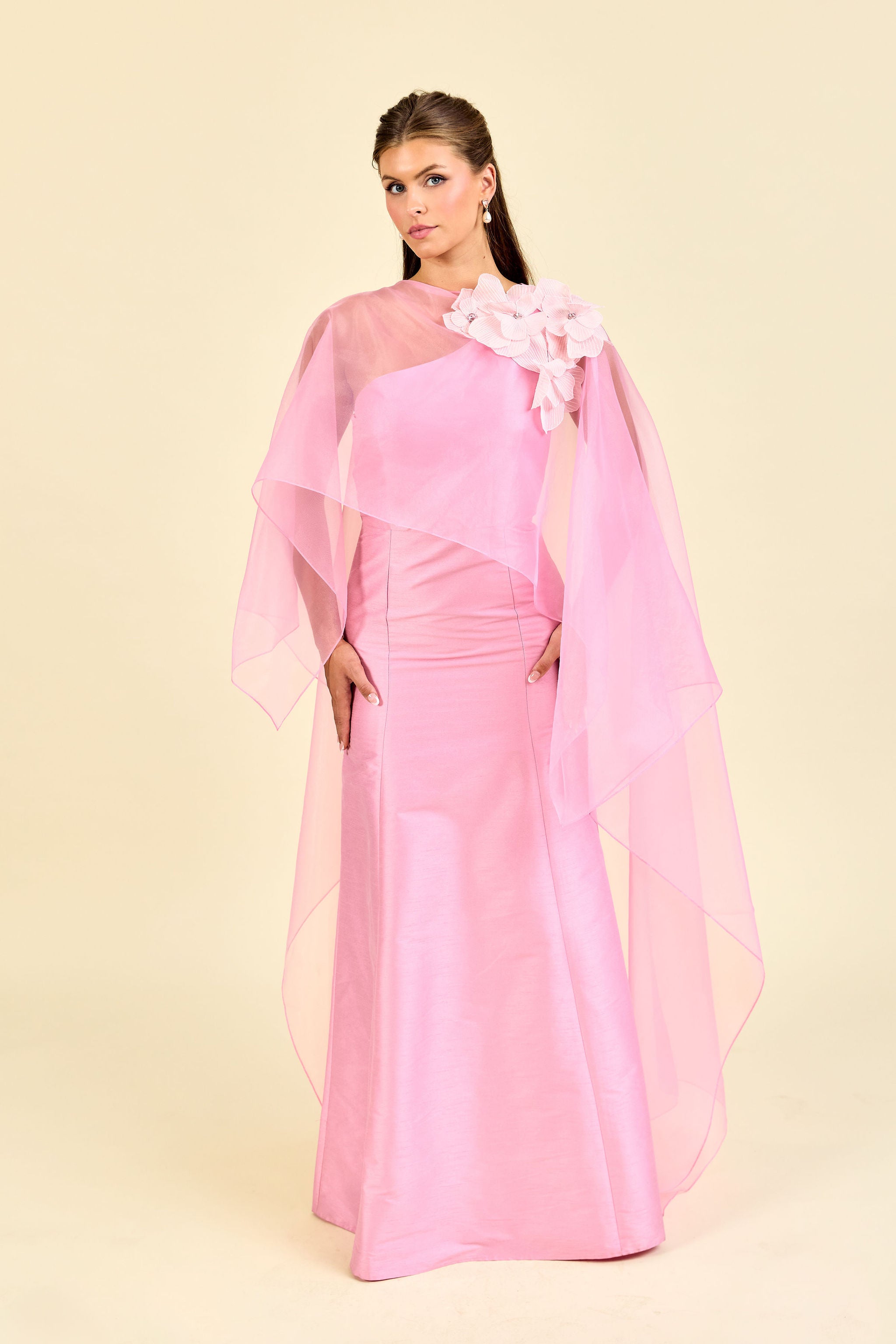 Our Beloved Embellished Cape is ther pefect way to elevate your evening look. Hand embellished Organza flowers feature crystal centers, and frame the wearer perfectly to create a luxe yet timeless style.