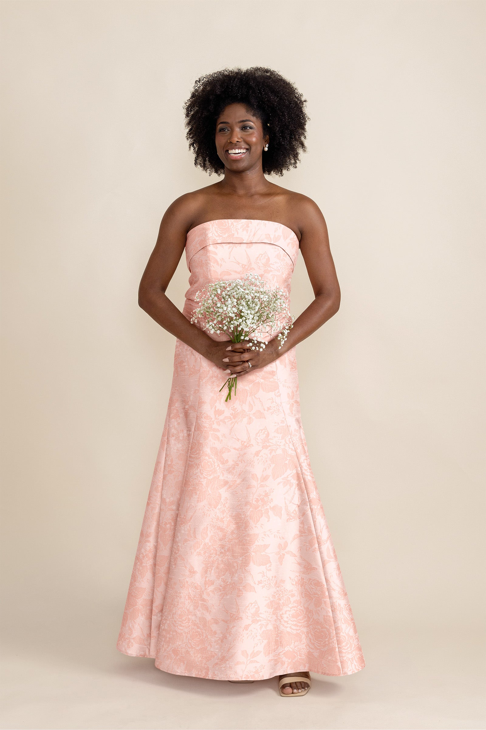 Shown here with our Trumpet Skirt, a relaxed fit and flare style. Photographed in Tea Rose Shantung.