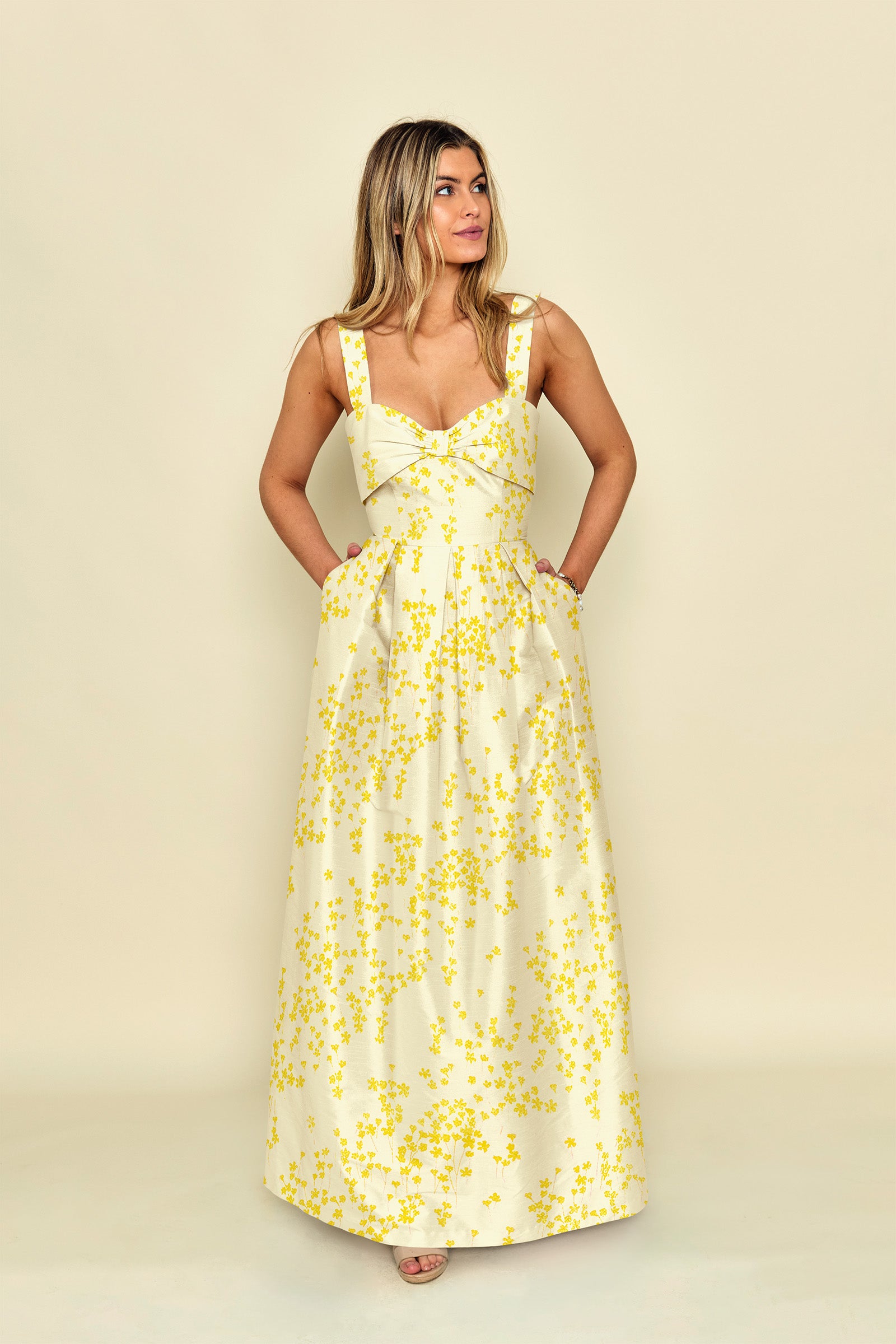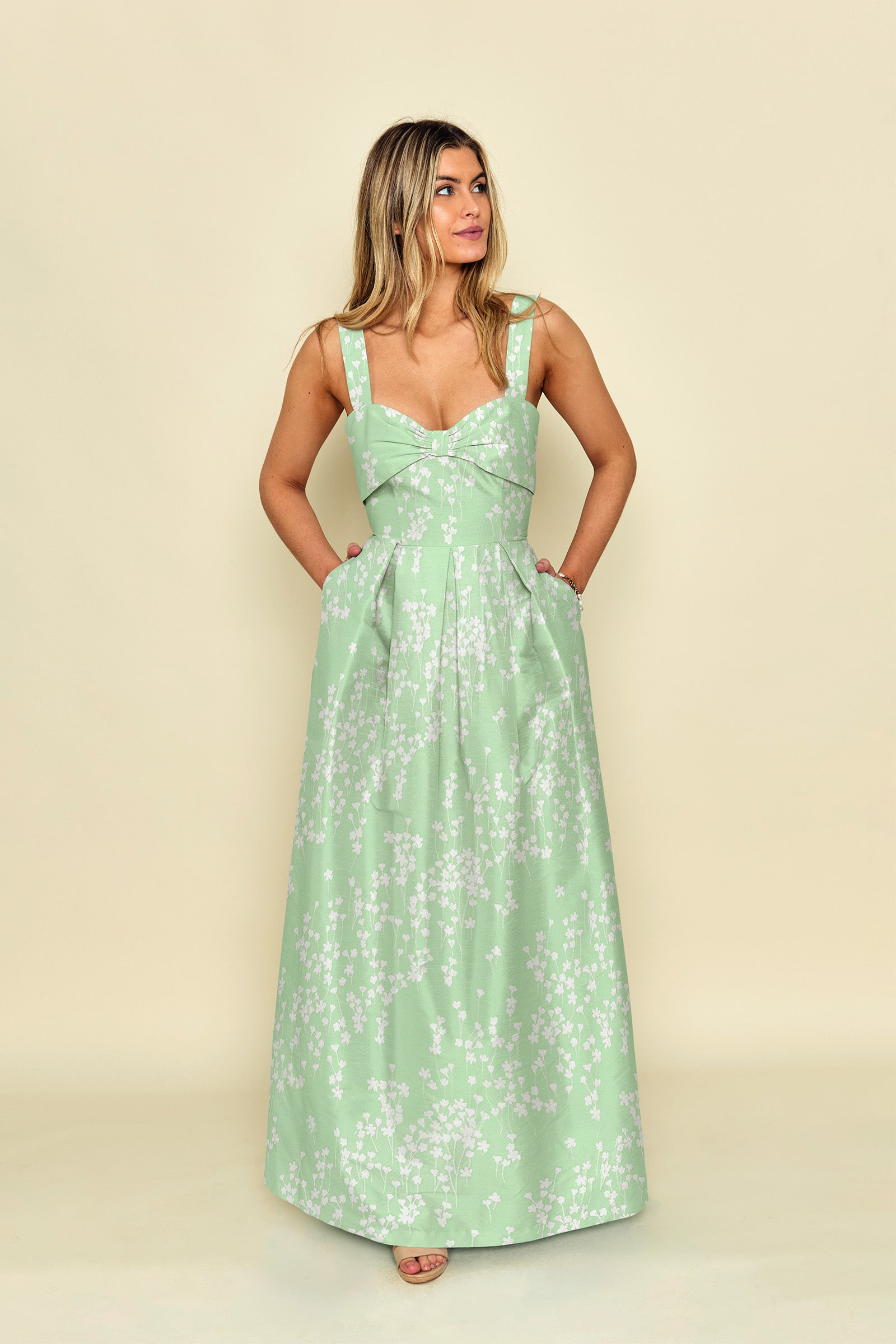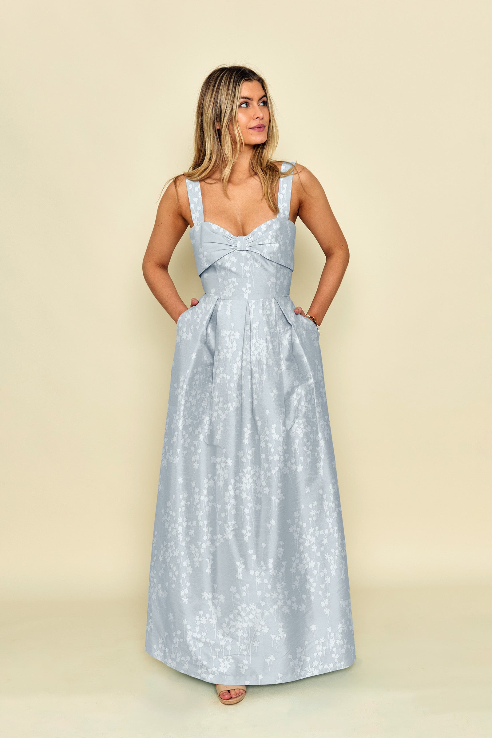 This flattering style features a sweetheart neckline and bow inspired overlay. She is shown here paired with our Dahlia Skirt, a pleated A- line skirt with pockets. Photographed in Sky Shantung.