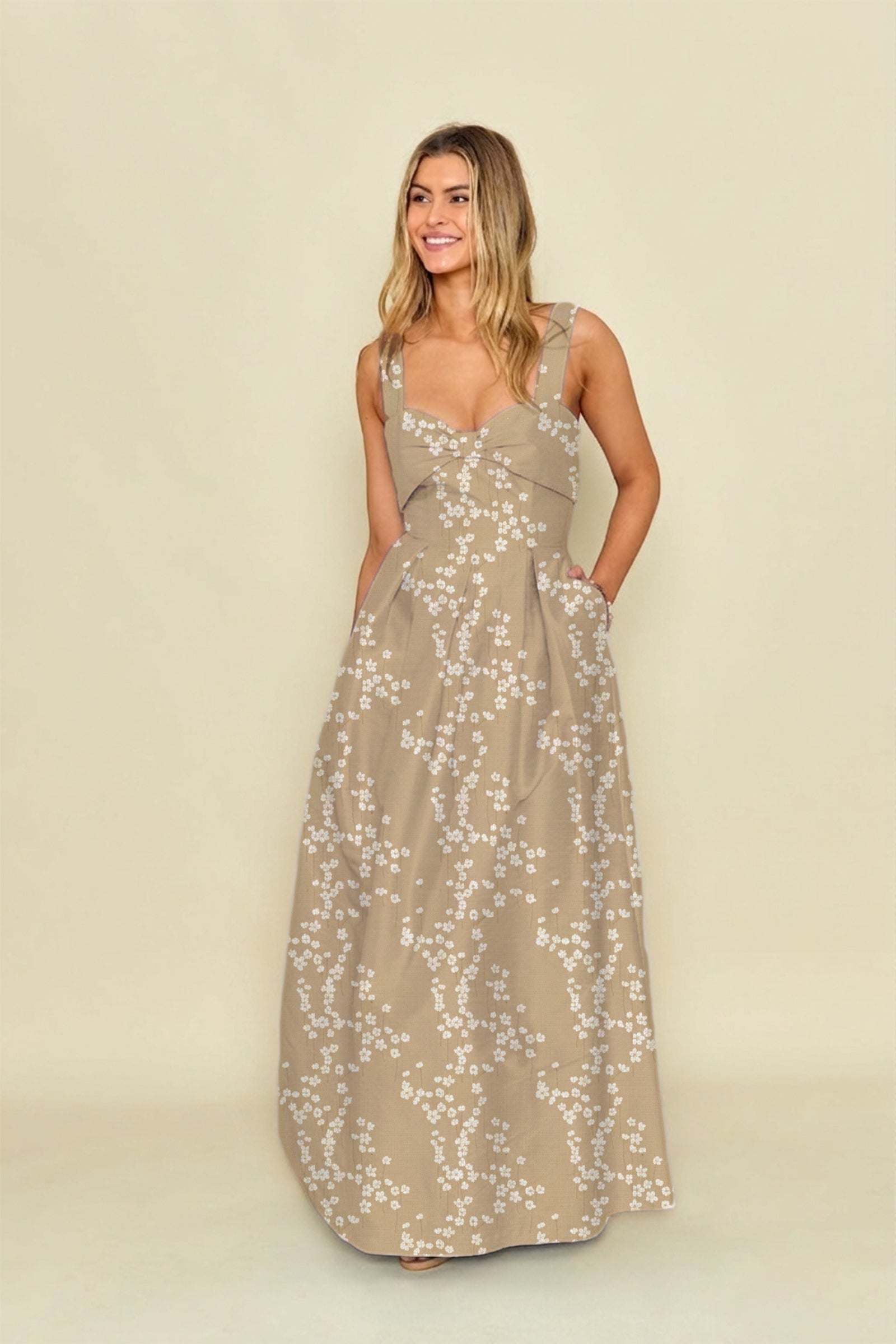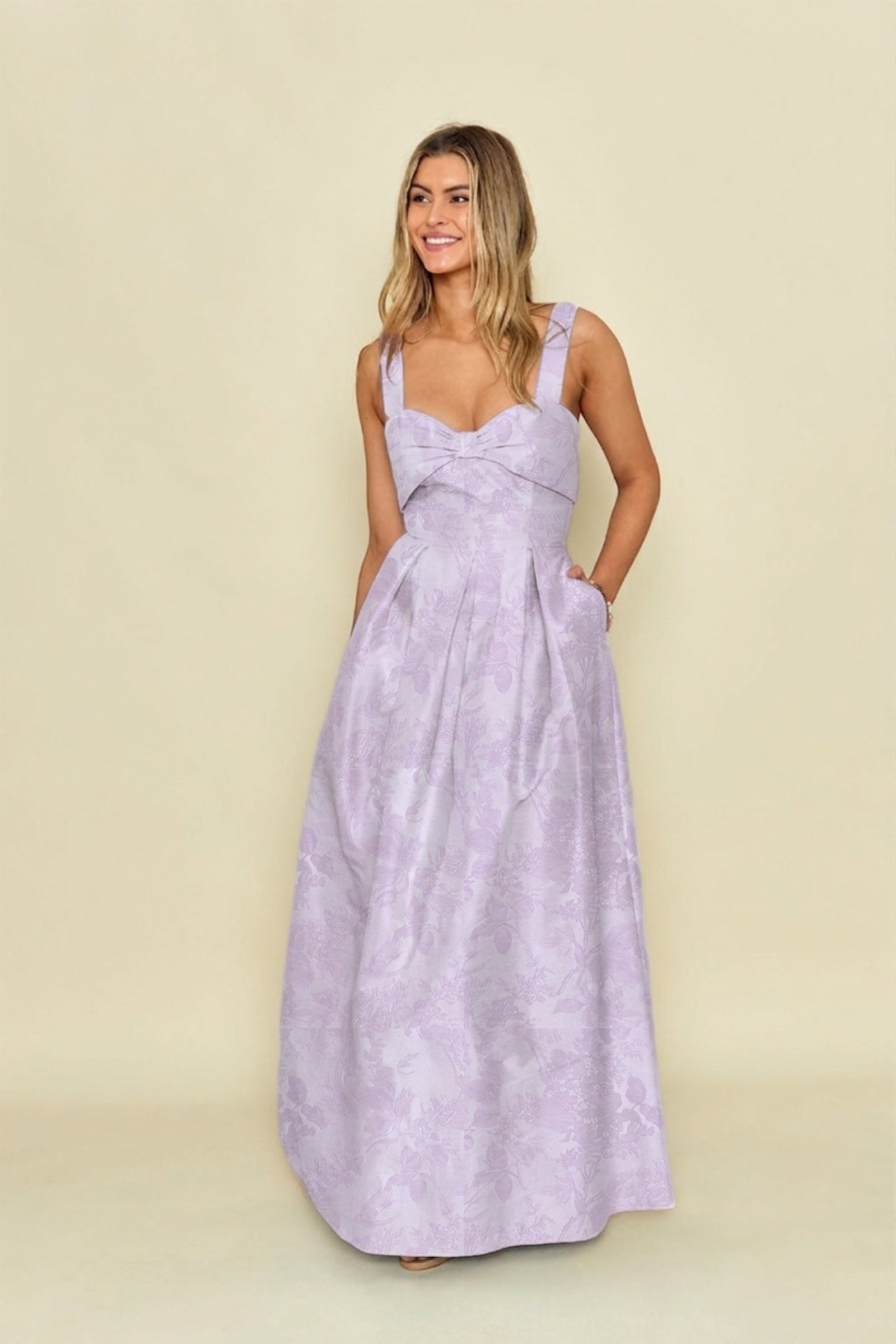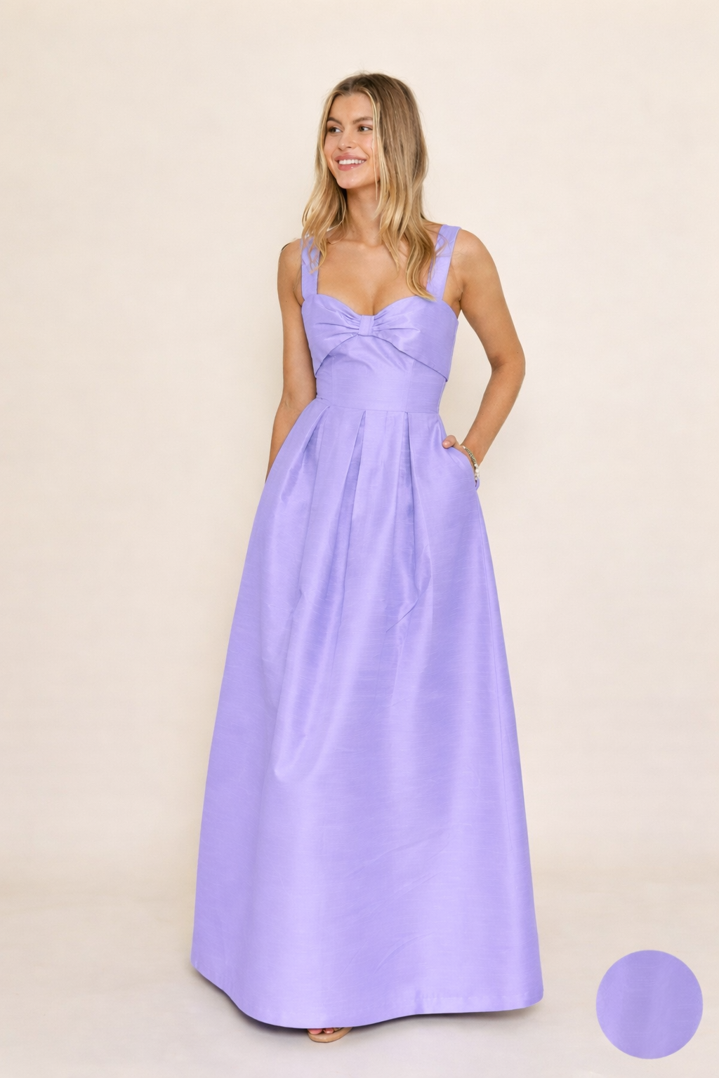 This flattering style features a sweetheart neckline and bow inspired overlay. She is shown here paired with our Dahlia Skirt, a pleated A- line skirt with pockets. Photographed in Sky Shantung.