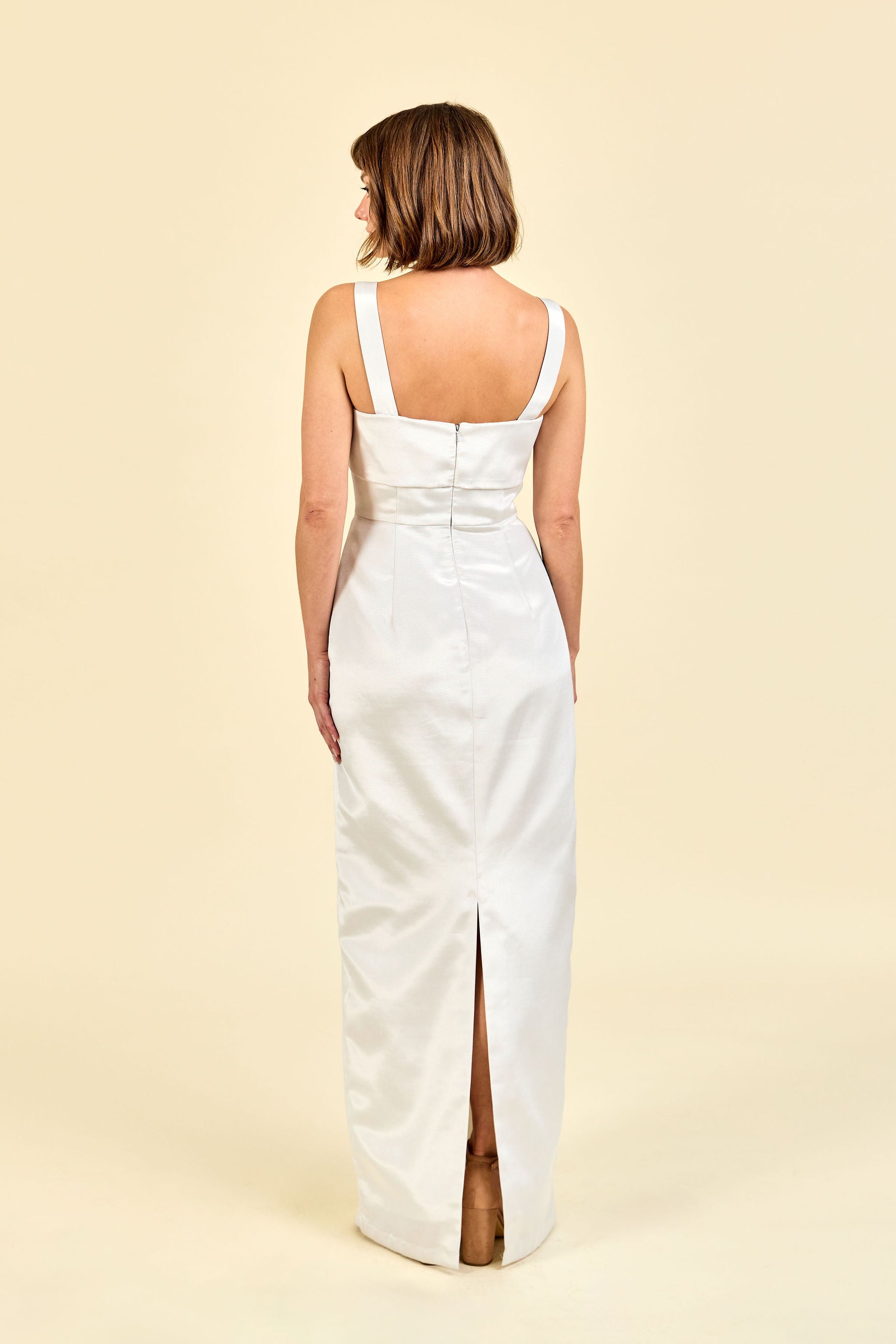 This flattering style features a sweetheart neckline and bow inspired overlay. She is shown here paired with our Straight Skirt, a sleek column style with a back slit for ease of movement. Photographed in Pearl Grey Bengaline.