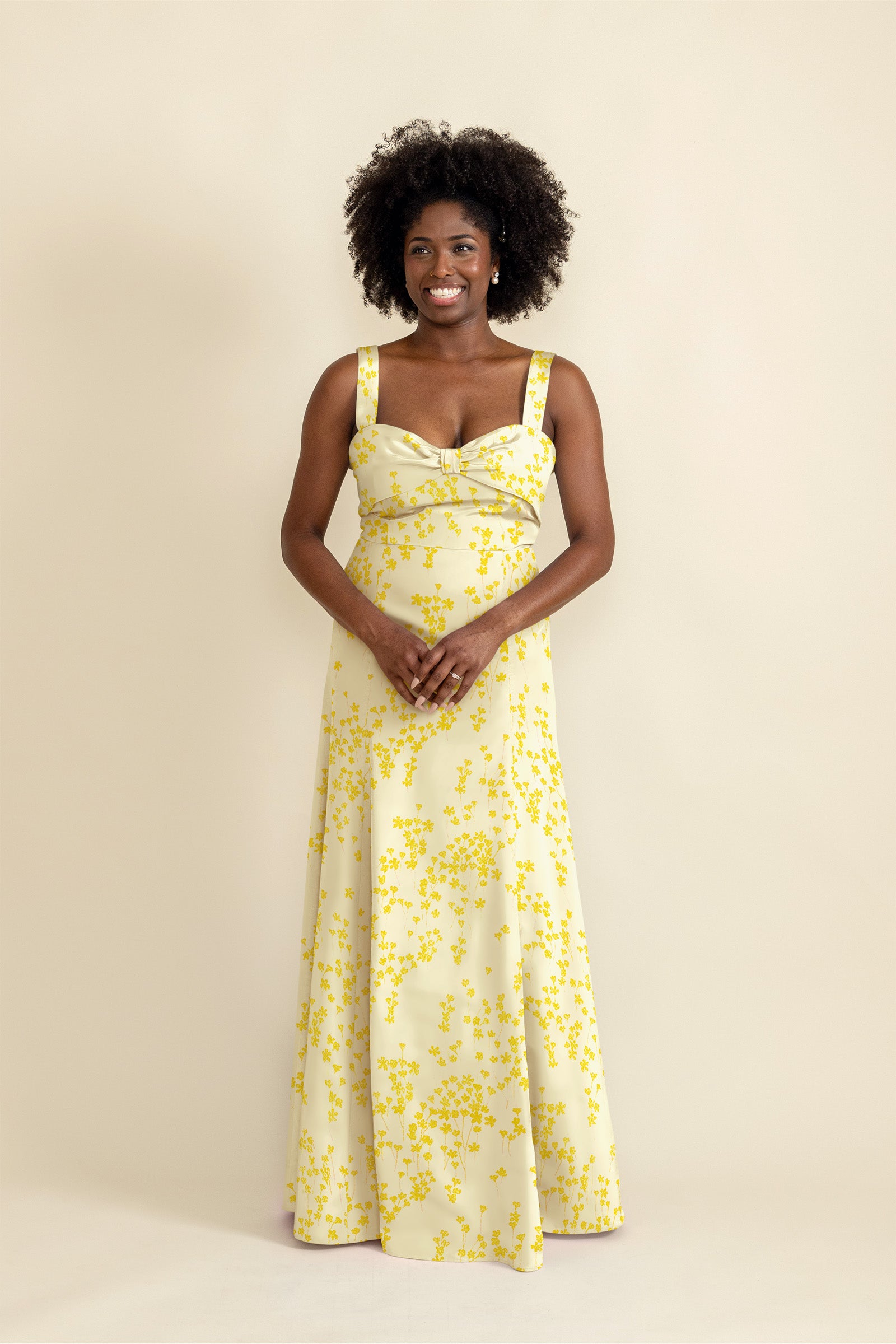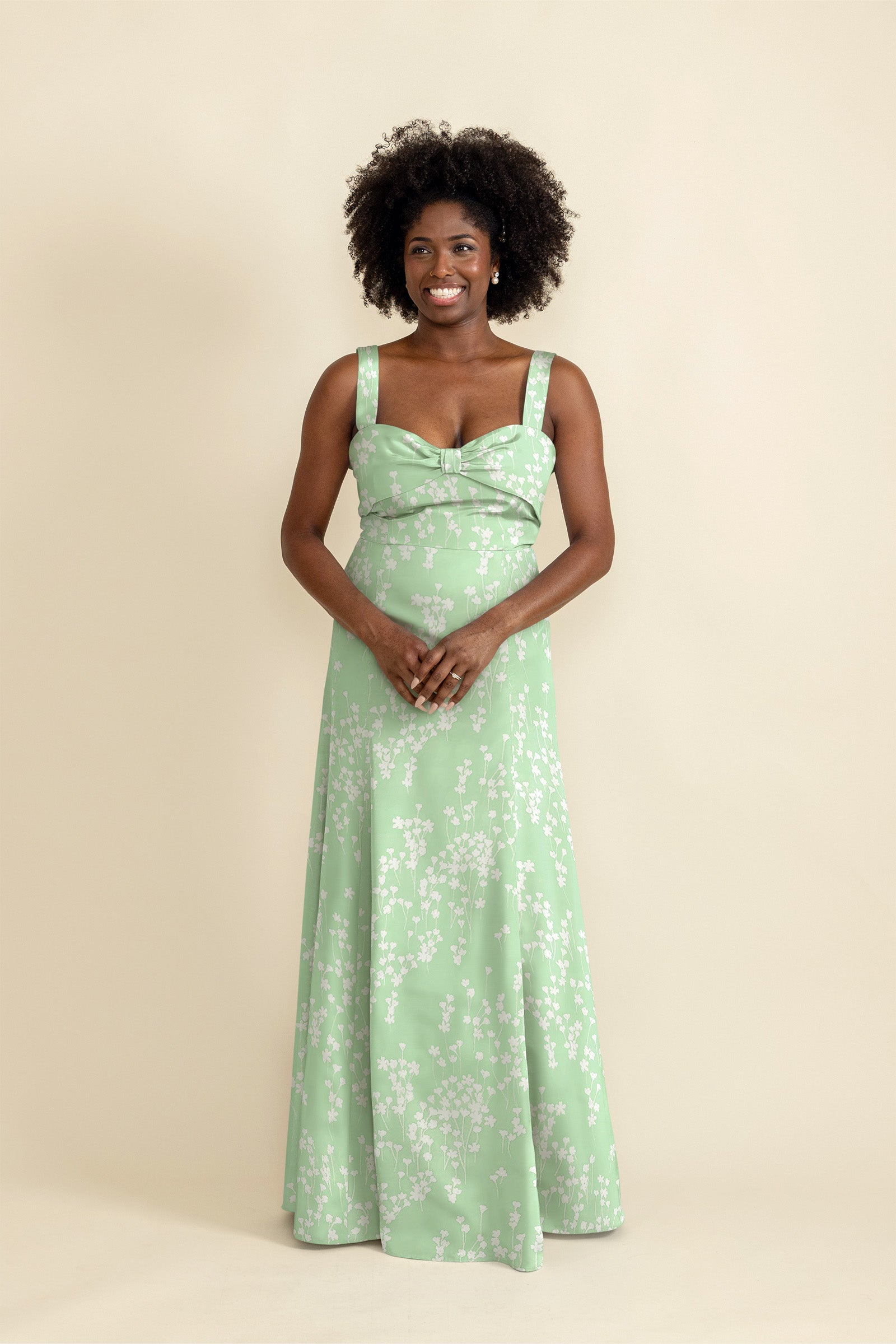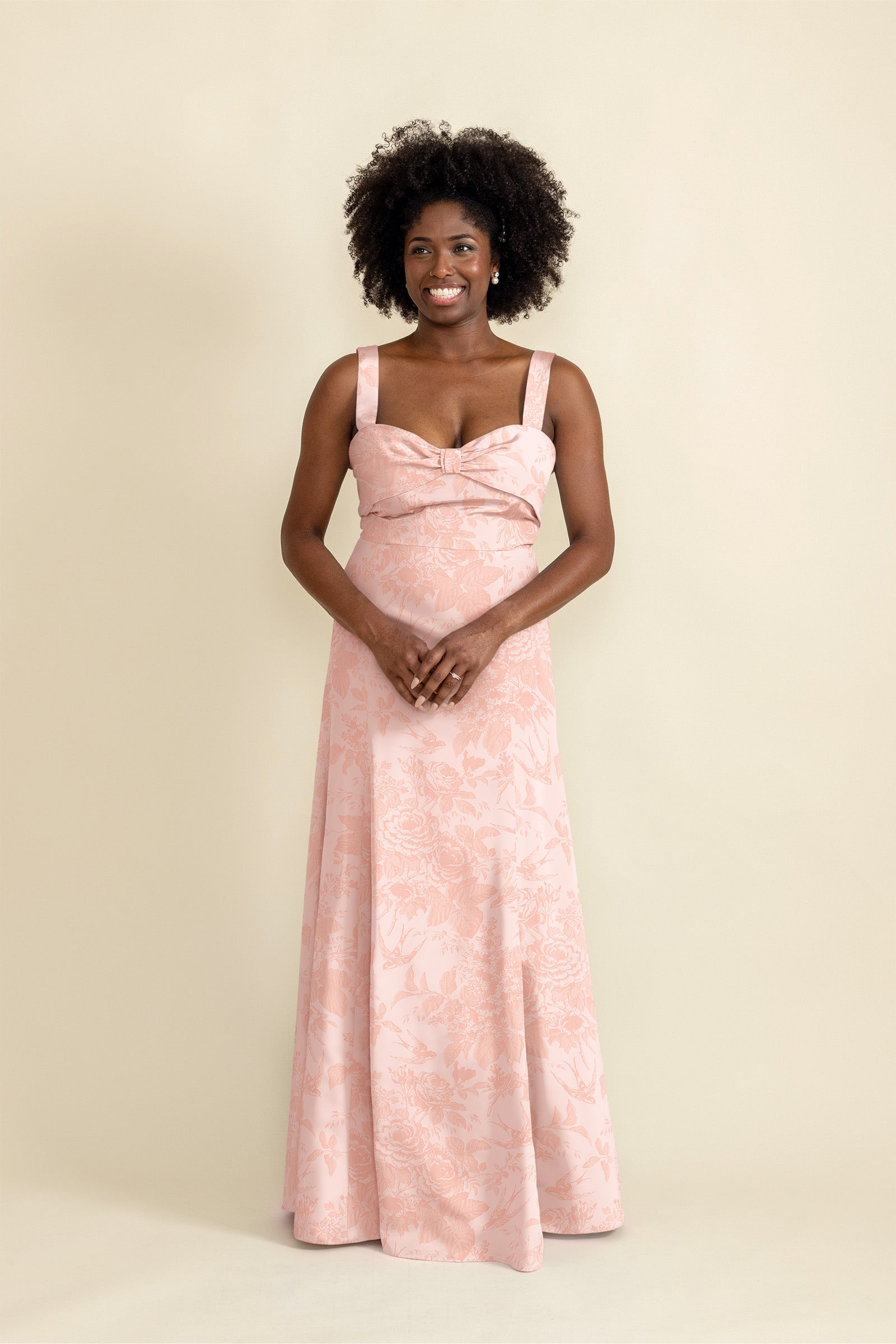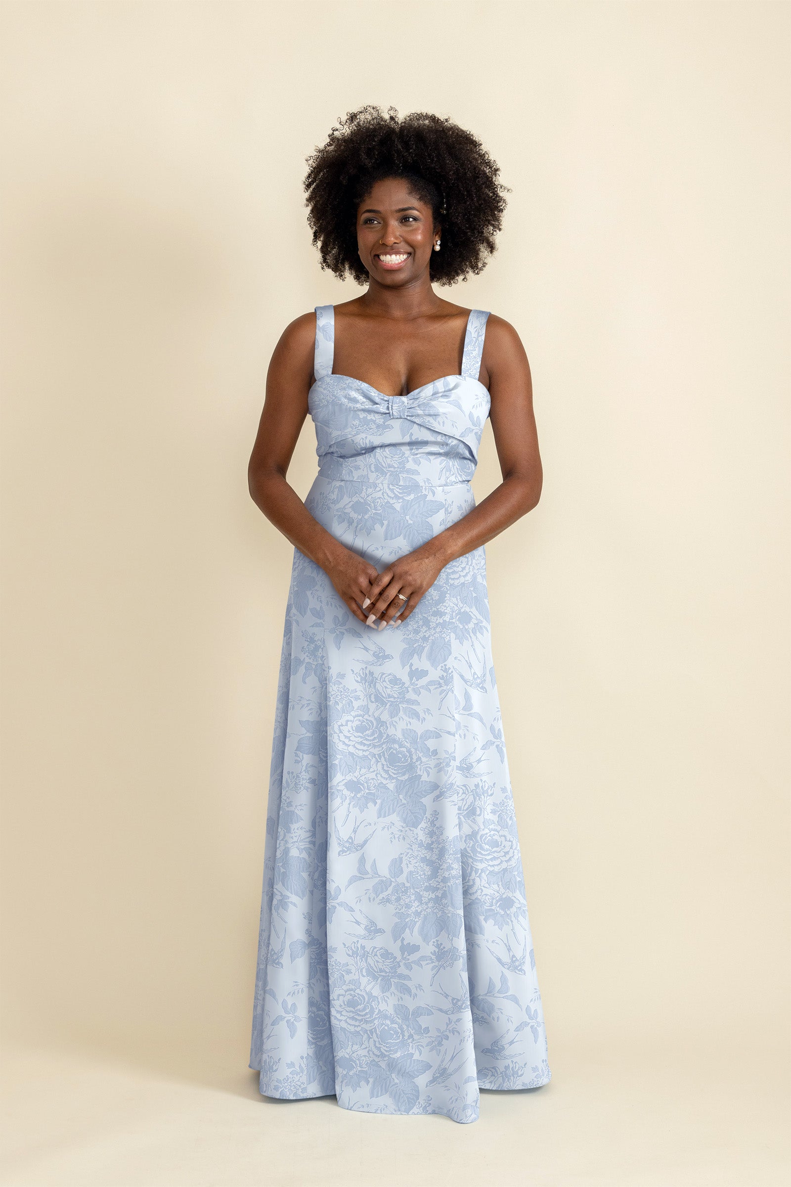 This flattering style features a sweetheart neckline and bow inspired overlay. She is shown here paired with our Trumpet Skirt, a relaxed fit and flare style with wonderful movement. Photographed in Hydrangea Faille.