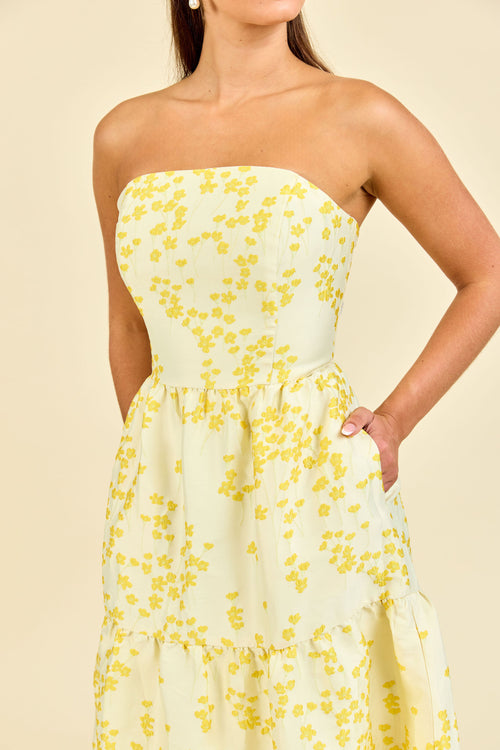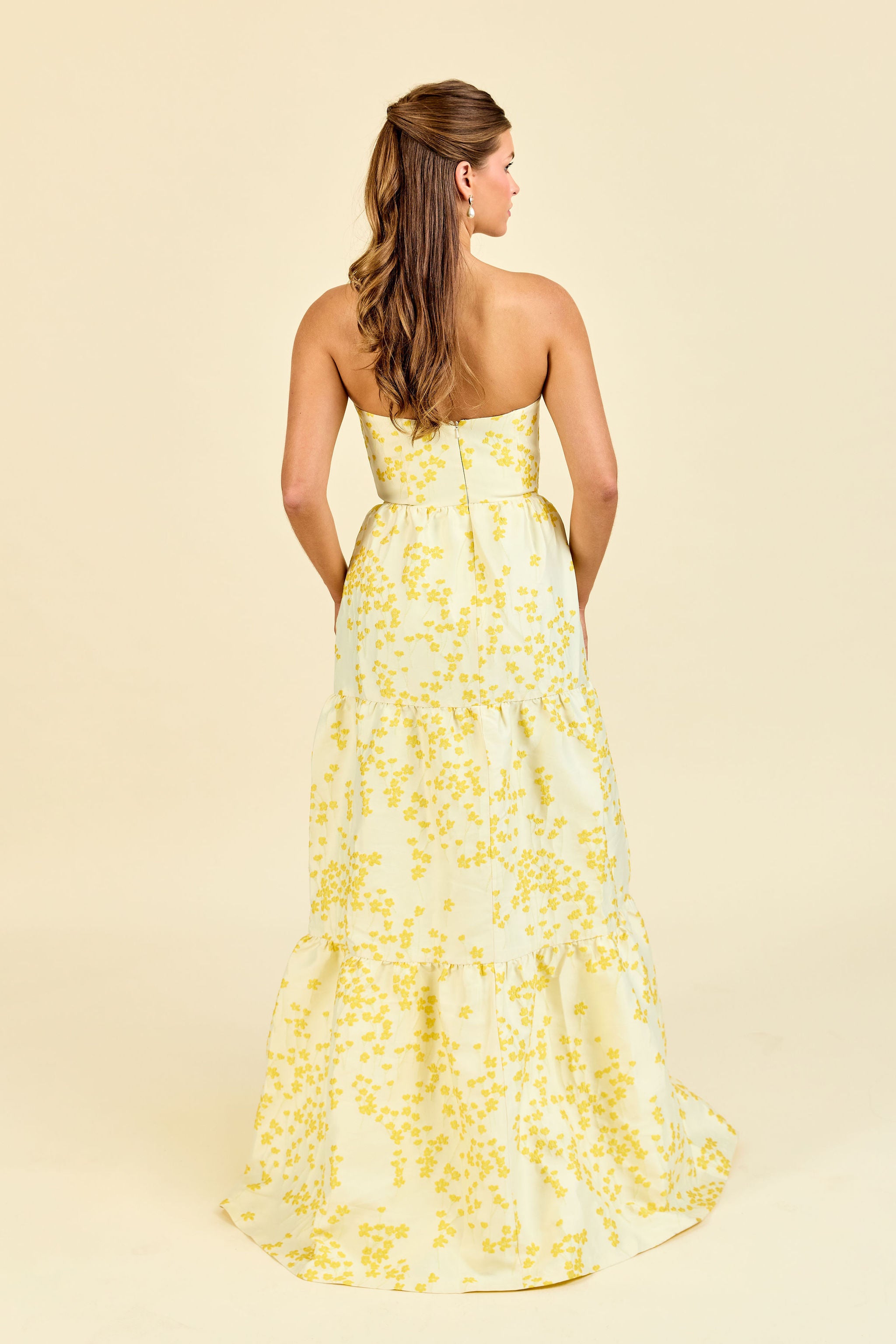 We love the sleek simplicity of our Hannah Dress. Shown here with our Tiered Skirt, photographed in our Sunshine Daisy Jacquard.