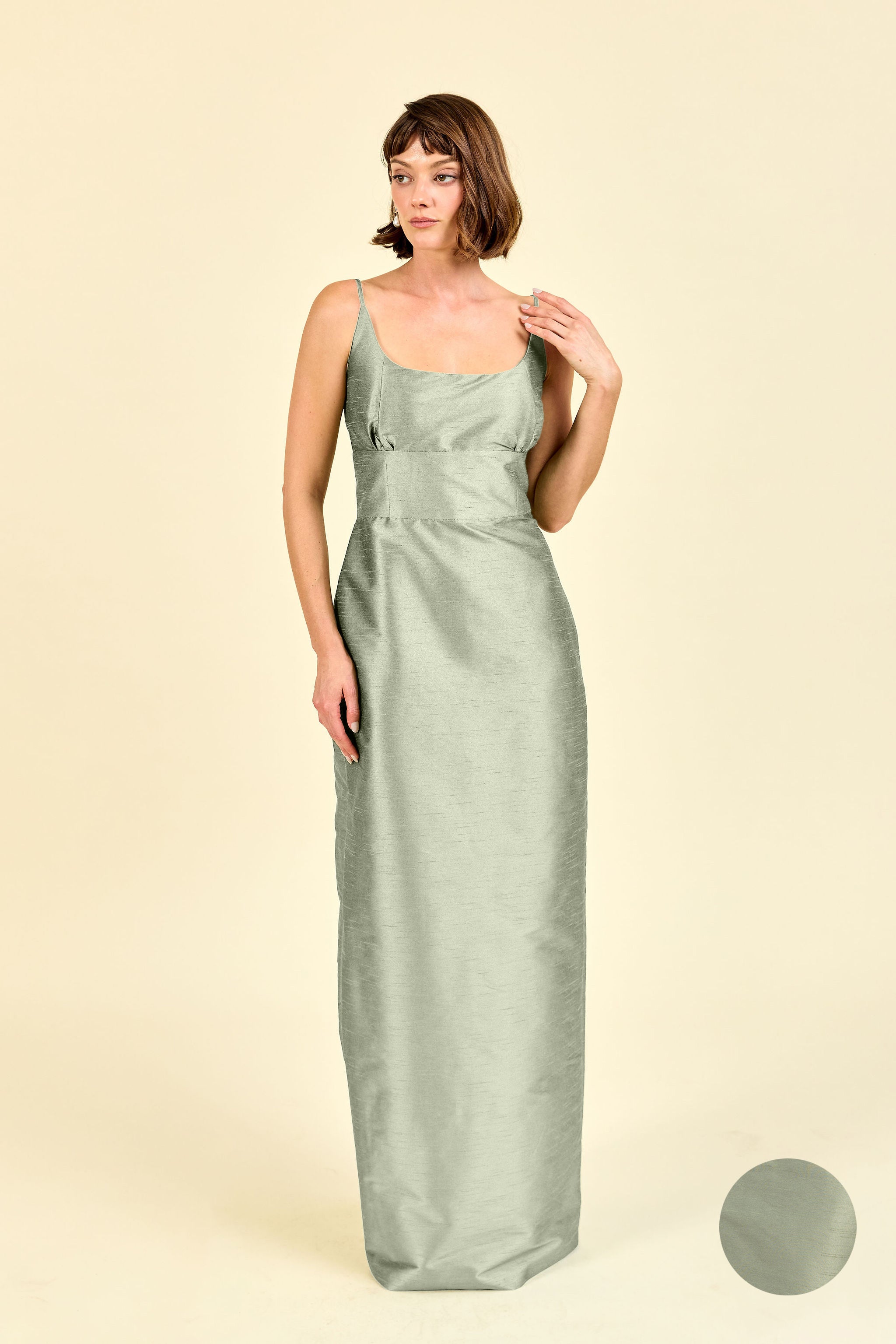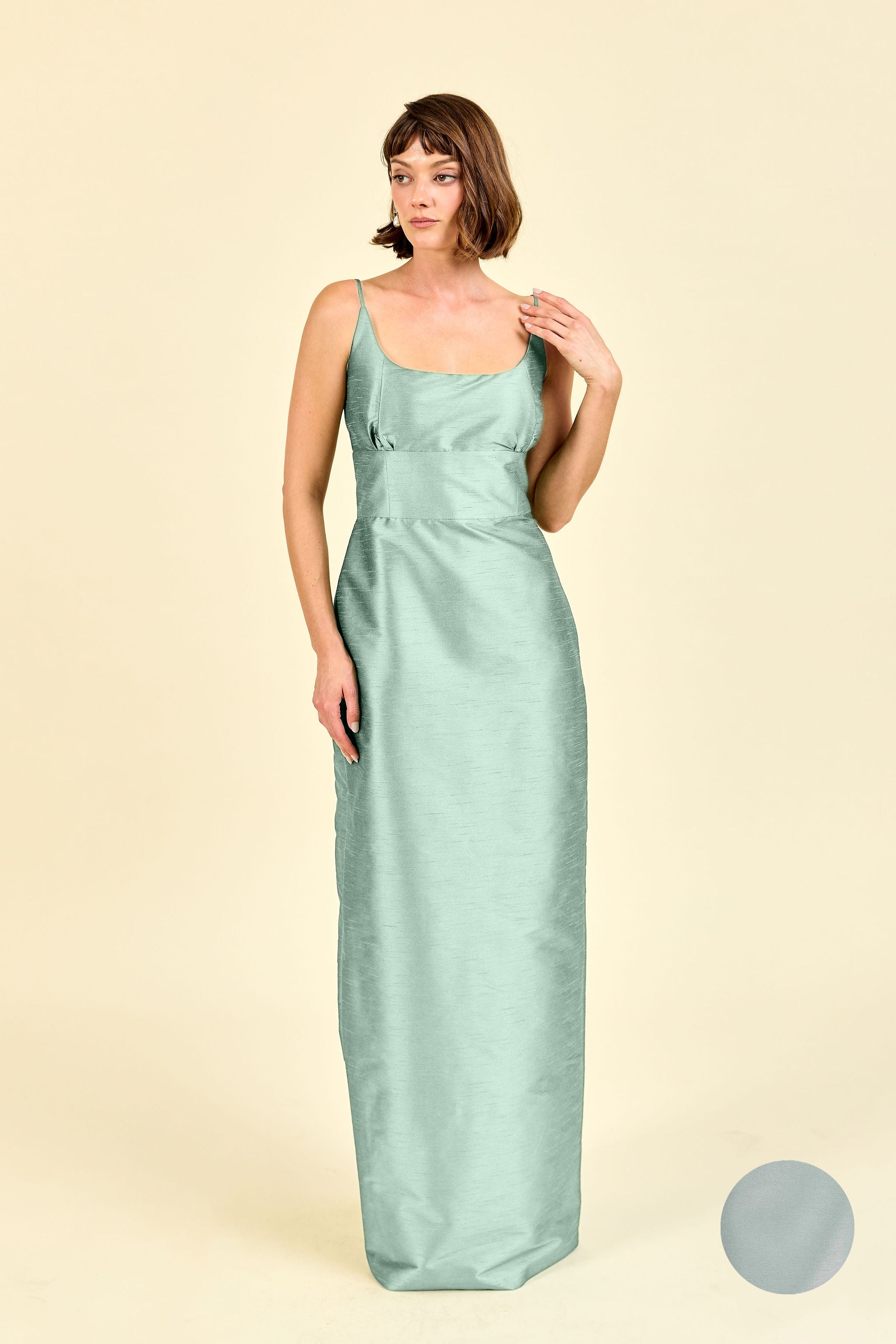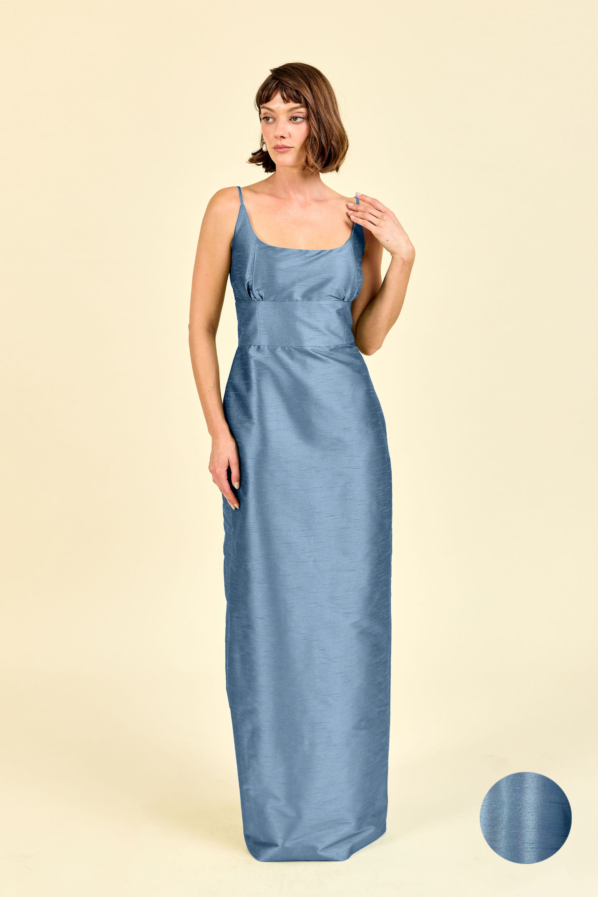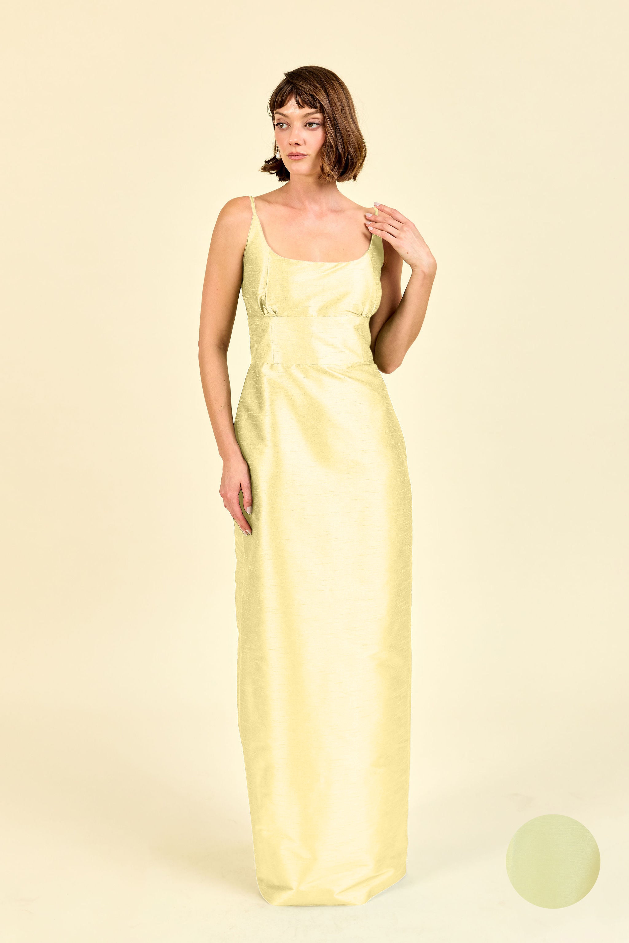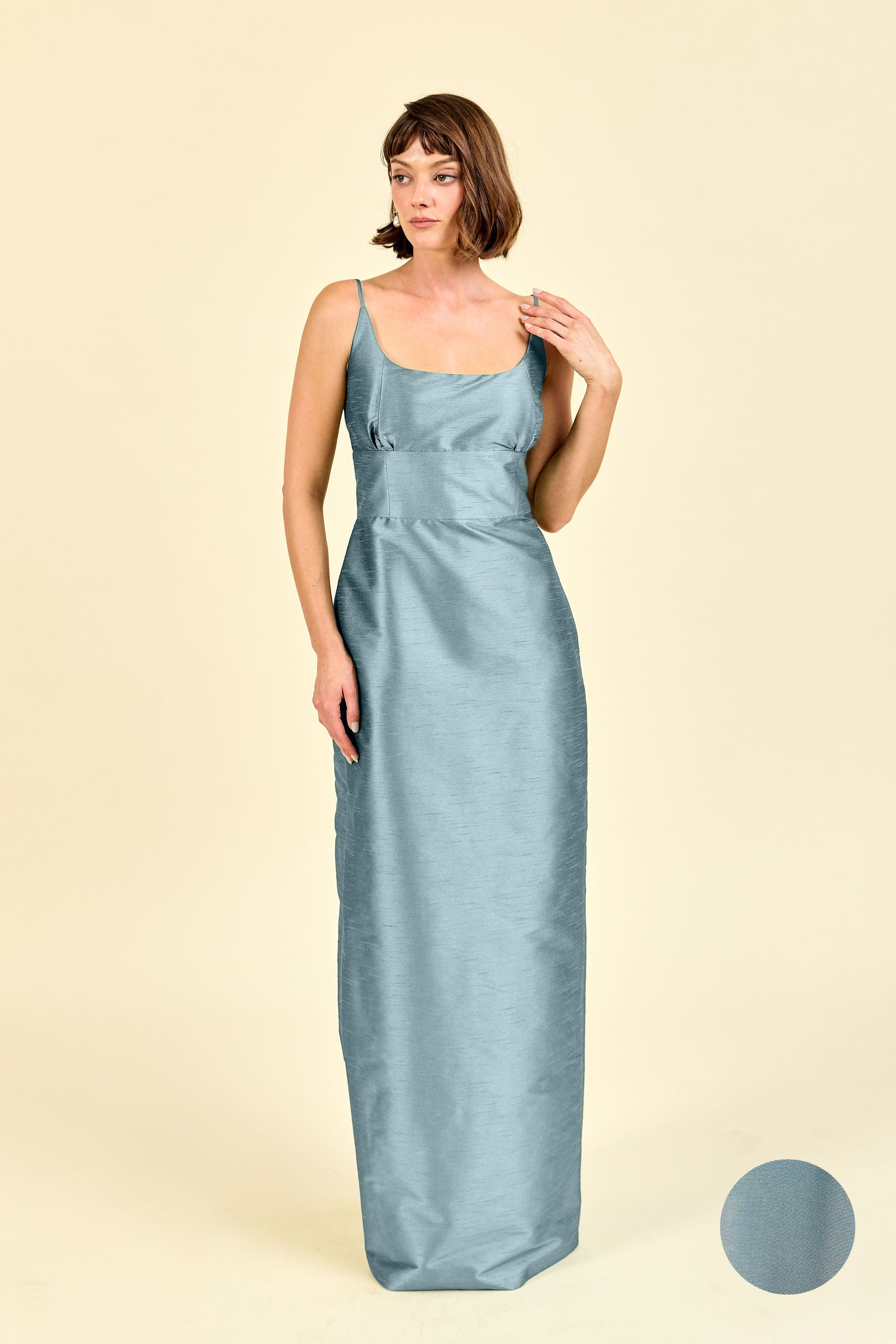 The Jane Dress is a feminine, scoop neck style with delicate adjustable spaghetti straps and a flattering wide waistband. A customer fave.