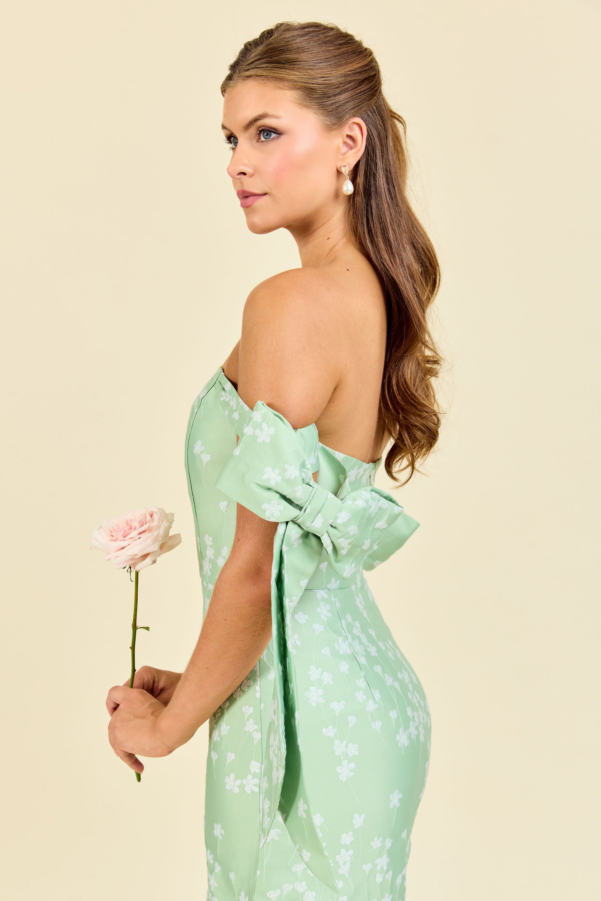 The Julie Dress is a romantic and elevated off the shoulder dress, featuring luxe bows at the arm.