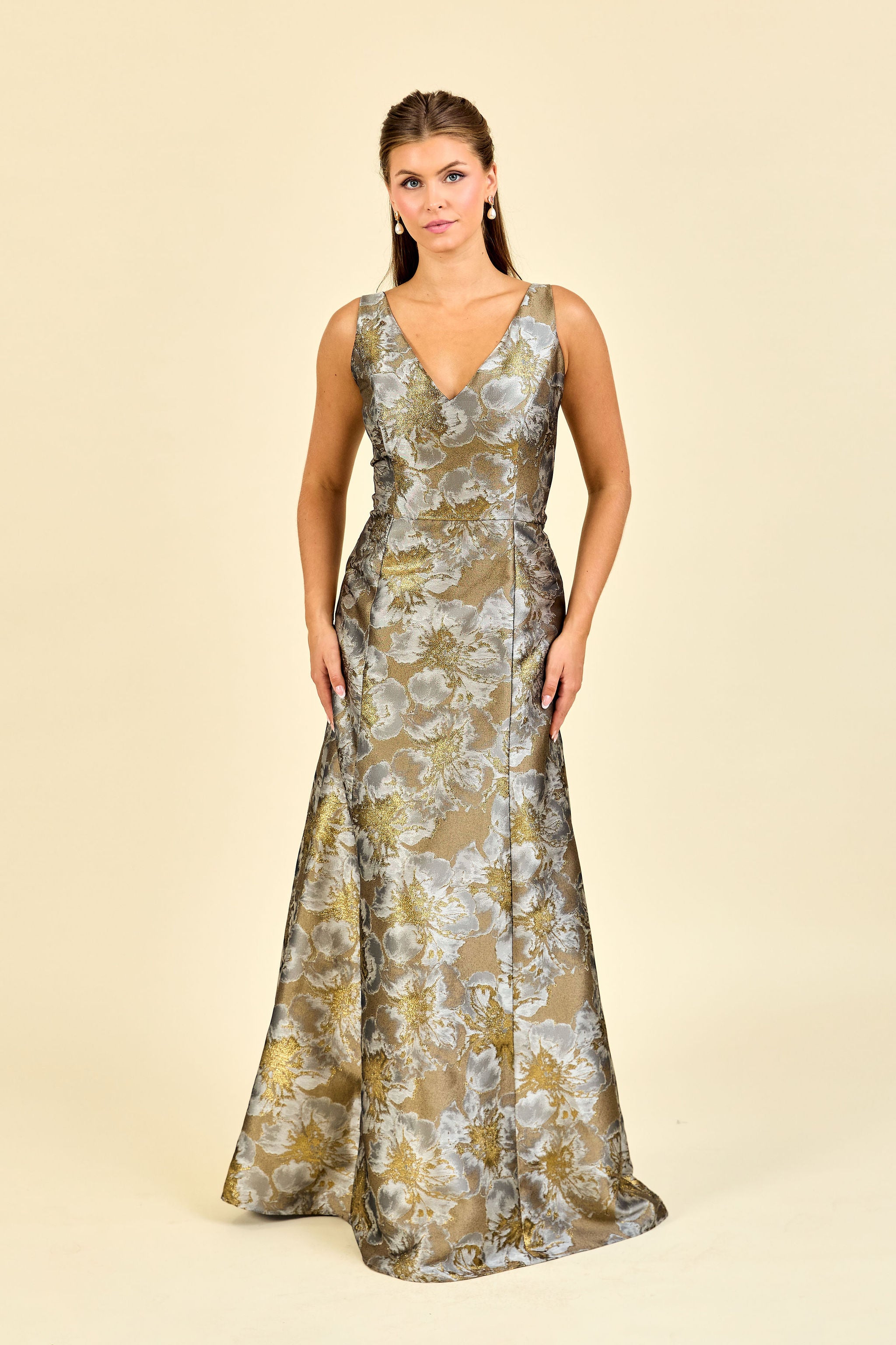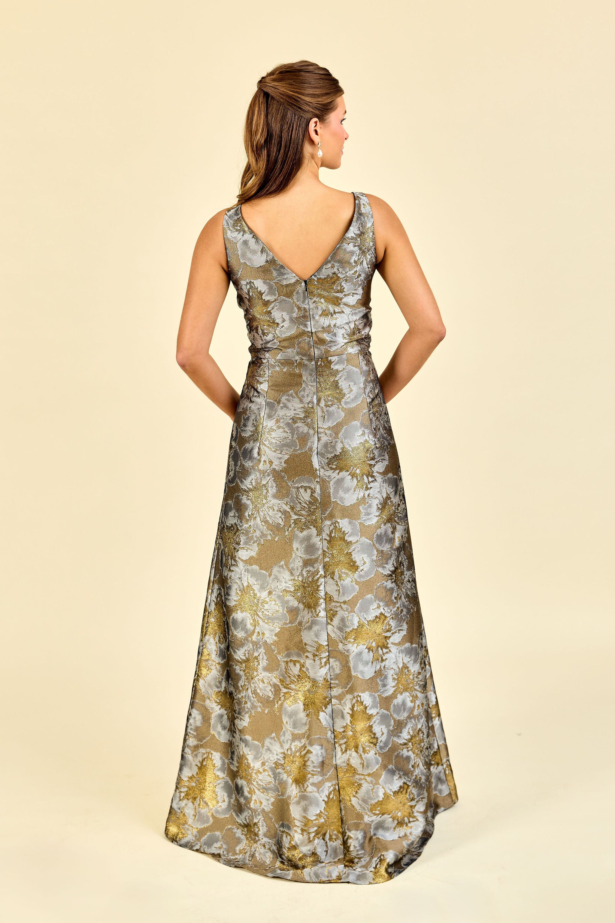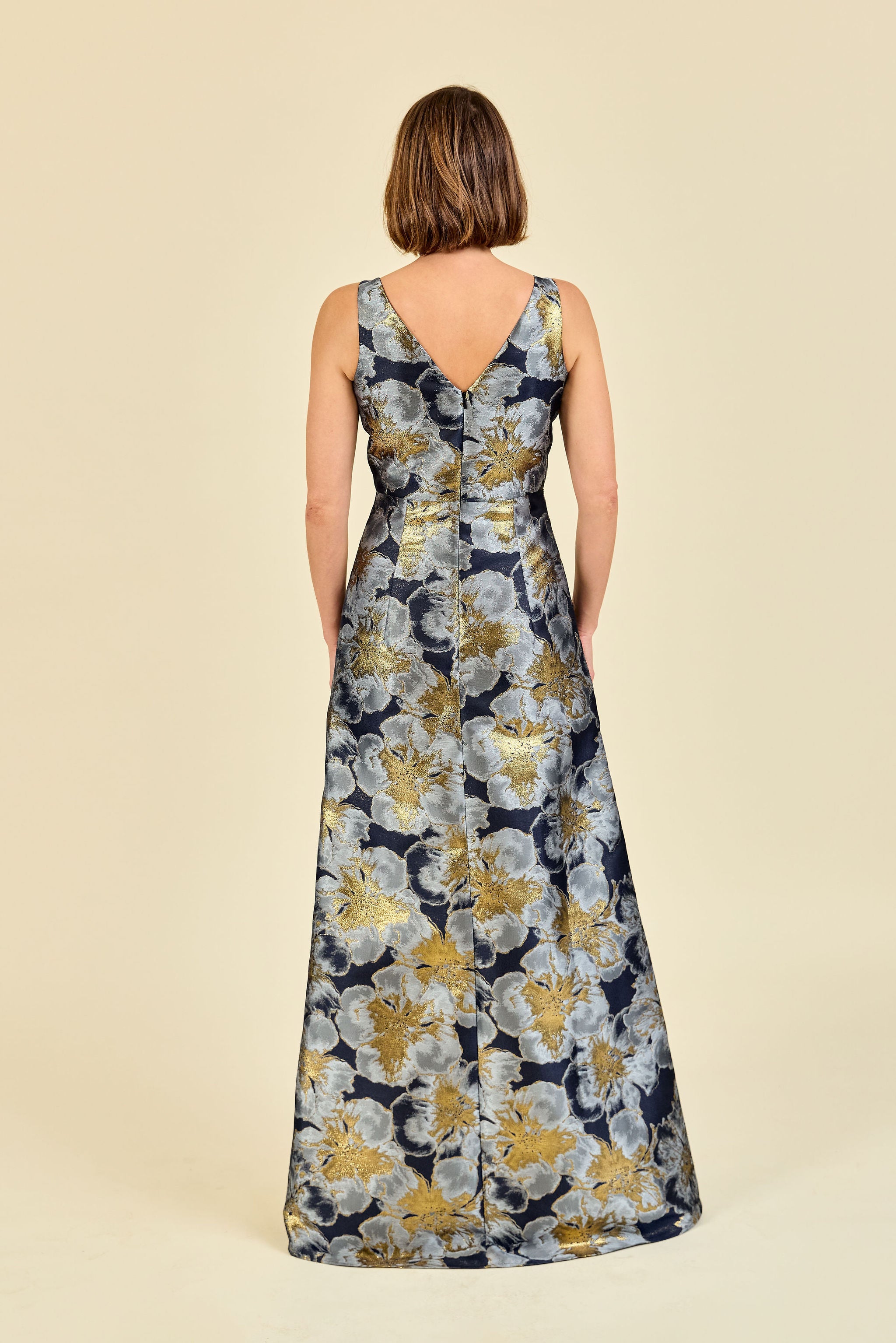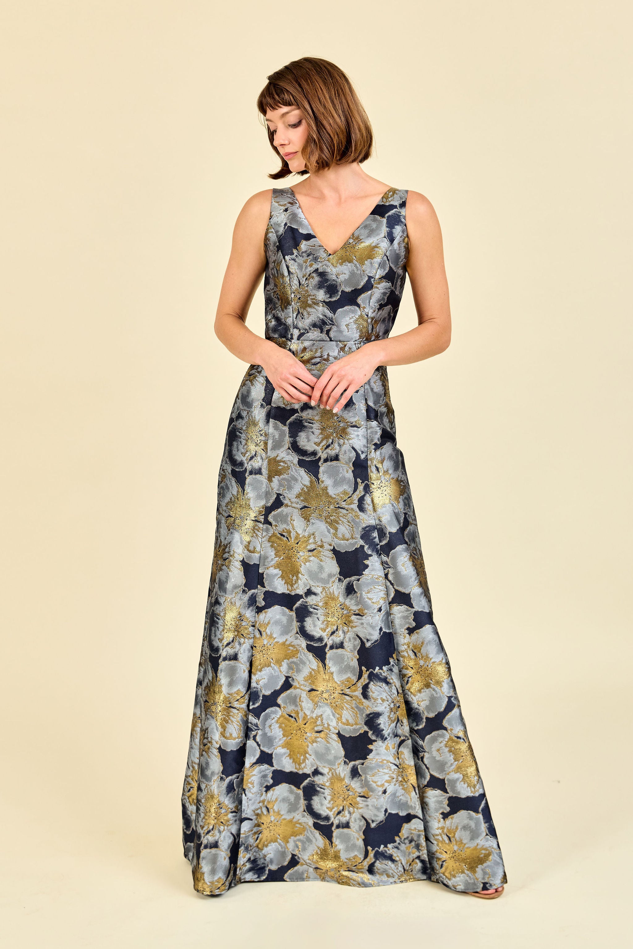 We love the subtle metallic threading throughout this textured floral jacquard. The fabric is structured to hold a crisp silhouette, yet light enough for a spring or summer event.