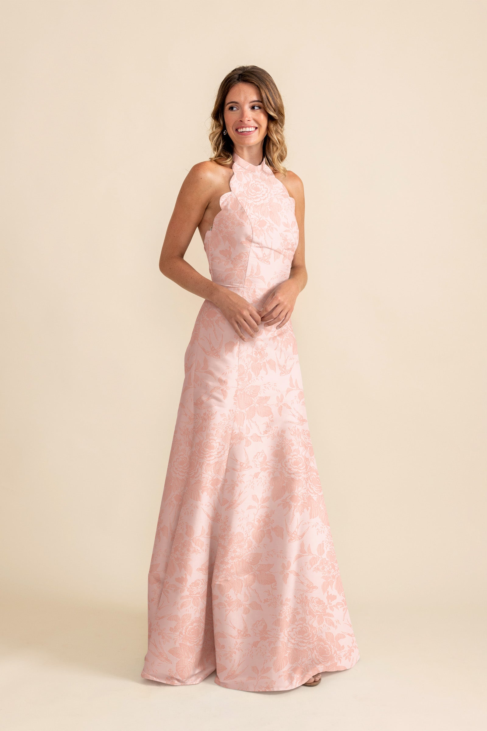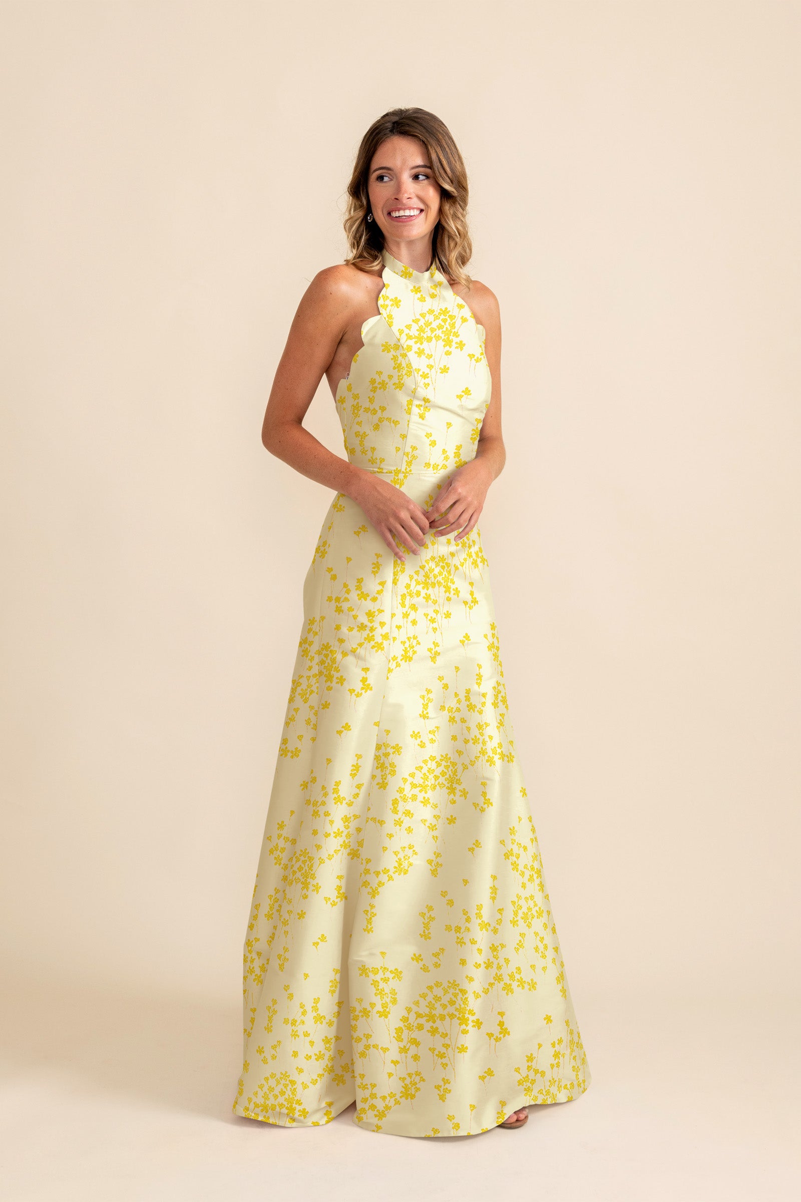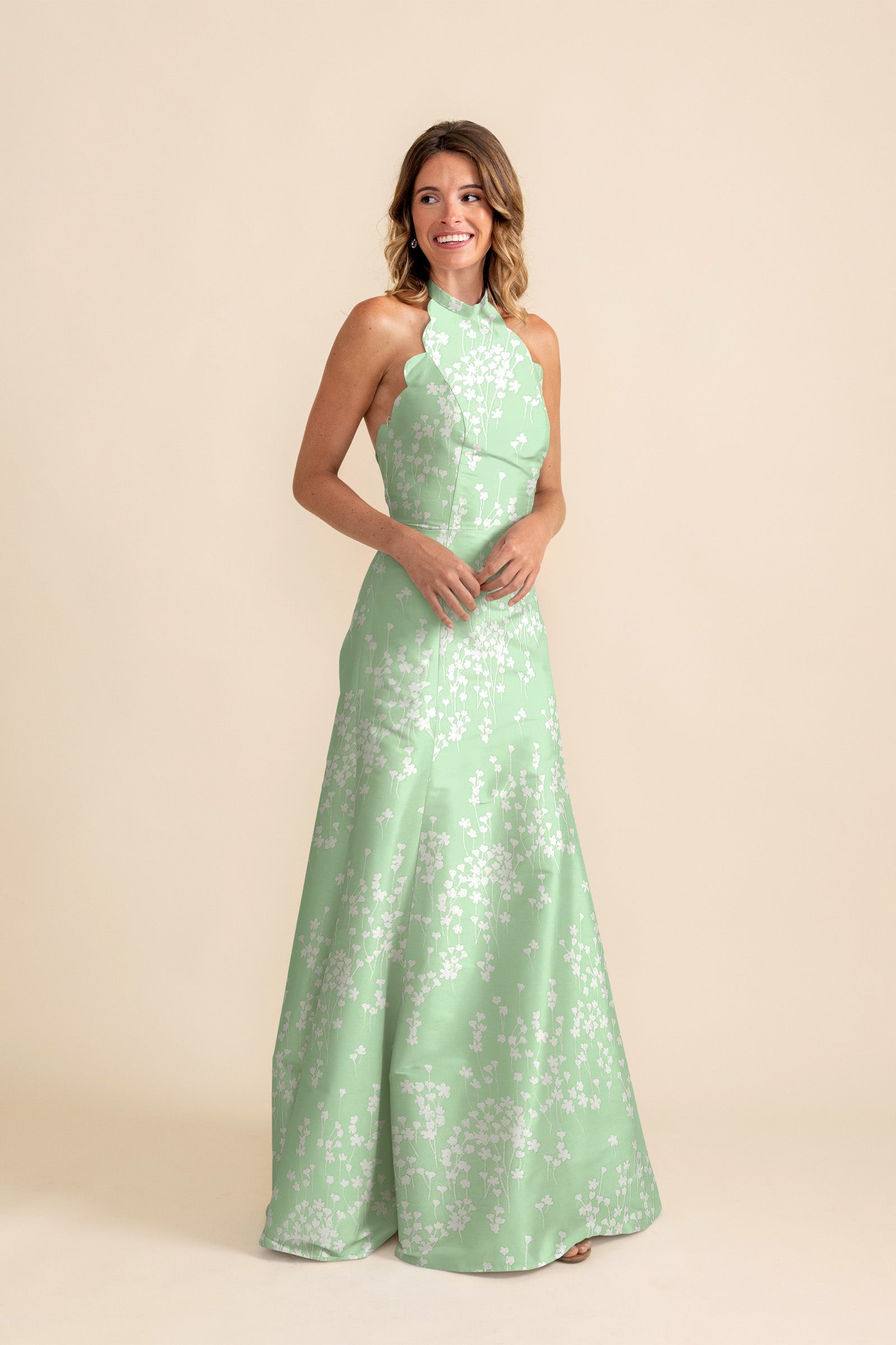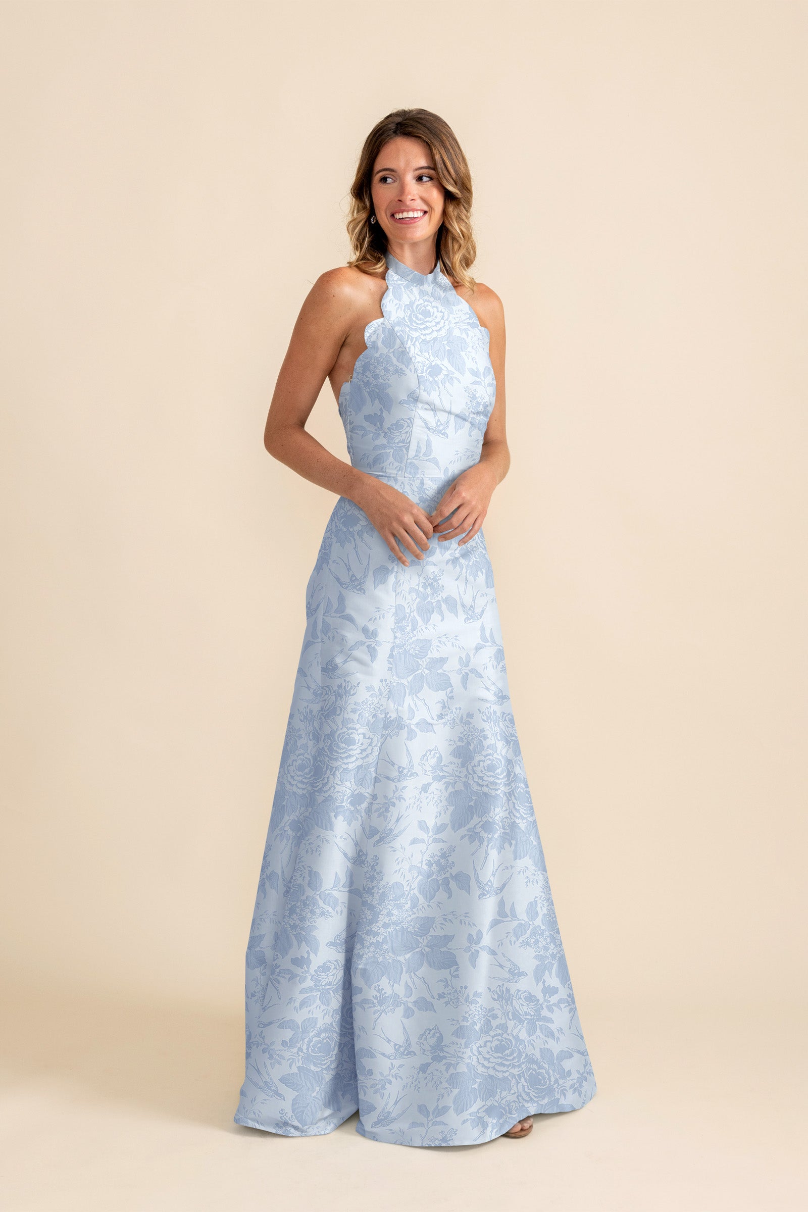 The Margot is a chic scalloped halter neckline. Shown here with the Trumpet Skirt. Photographed in Sky Shantung.