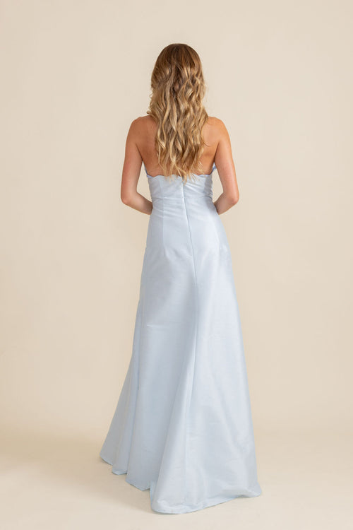 The Margot is a chic scalloped halter neckline. Shown here with the Trumpet Skirt. Photographed in Sky Shantung.