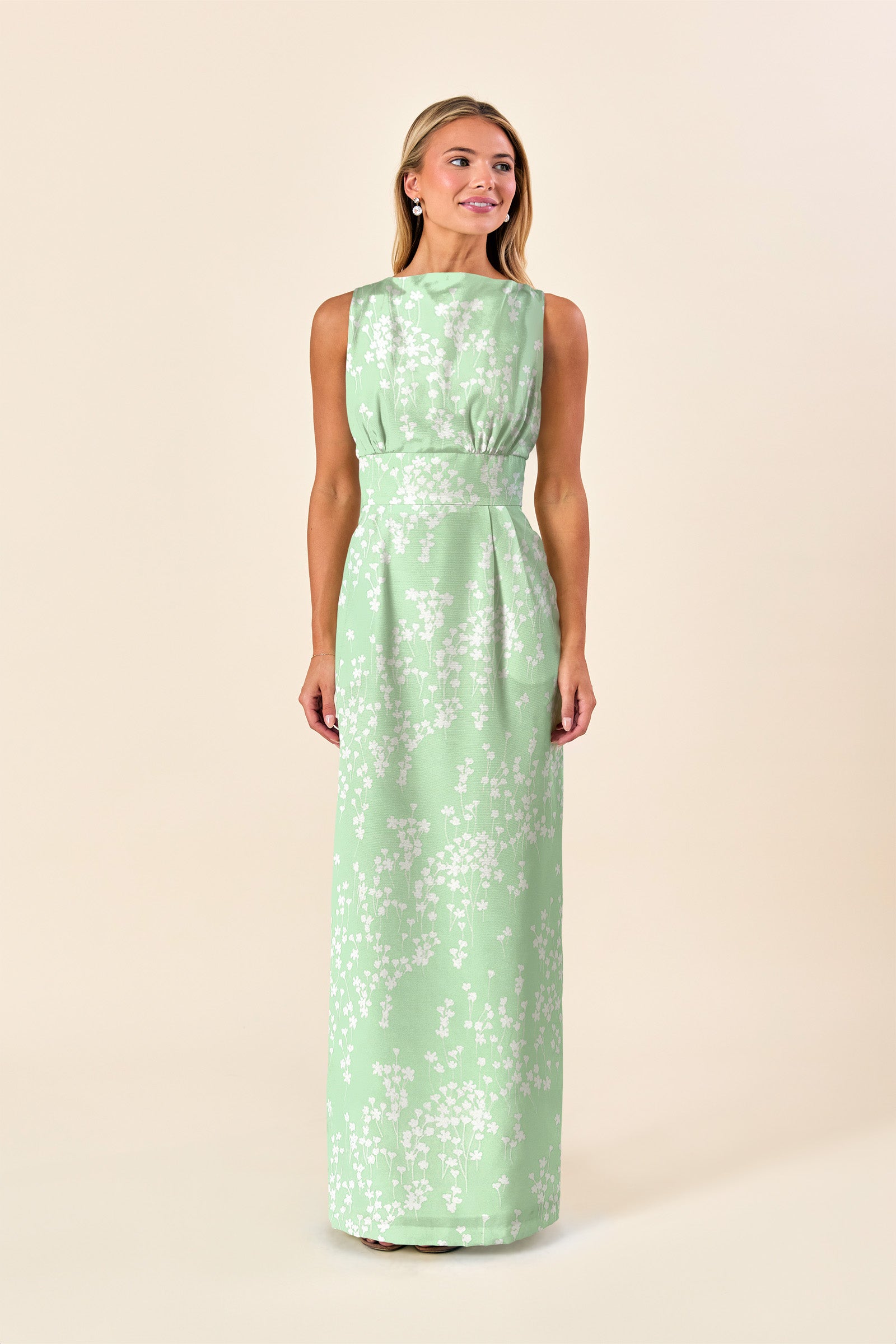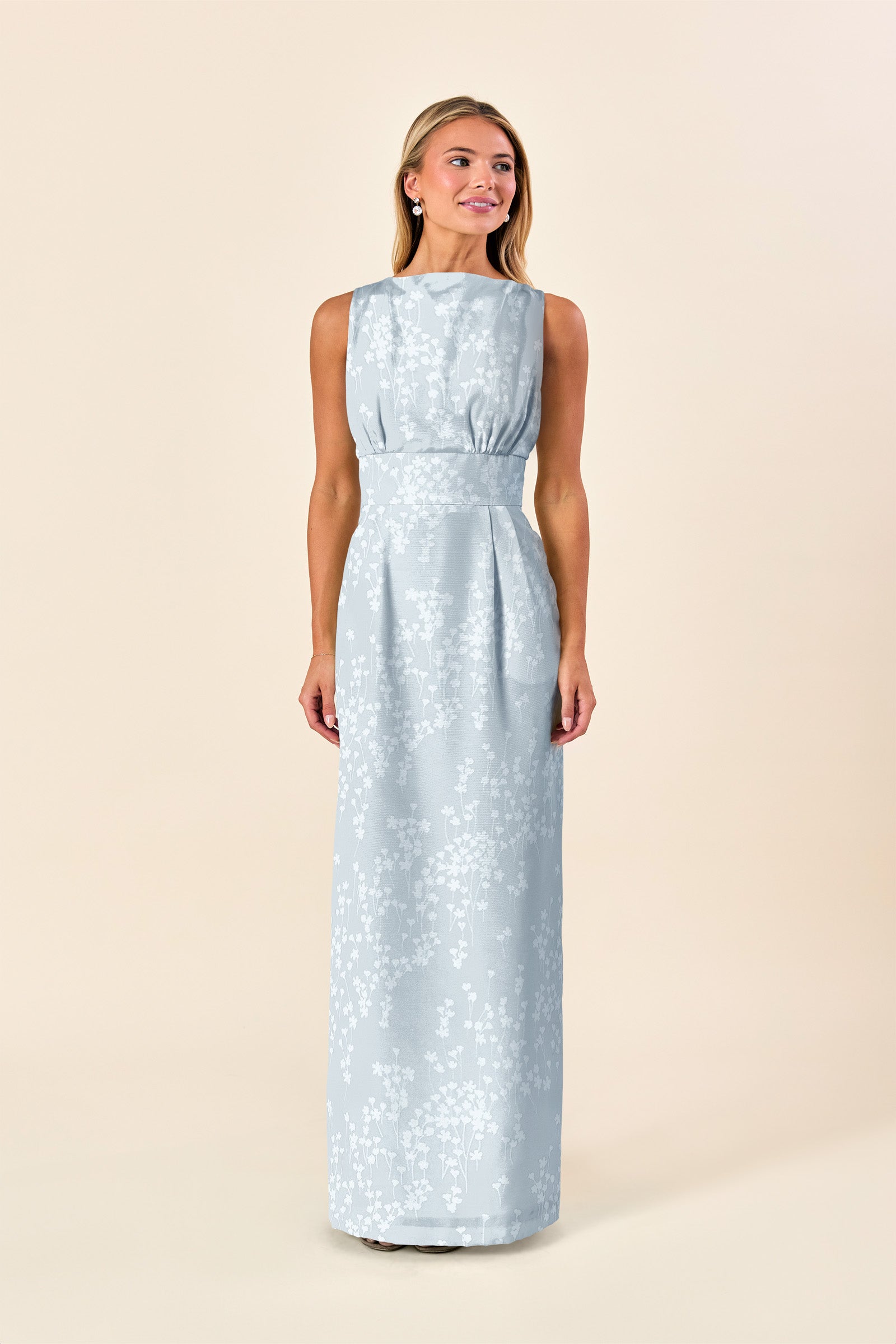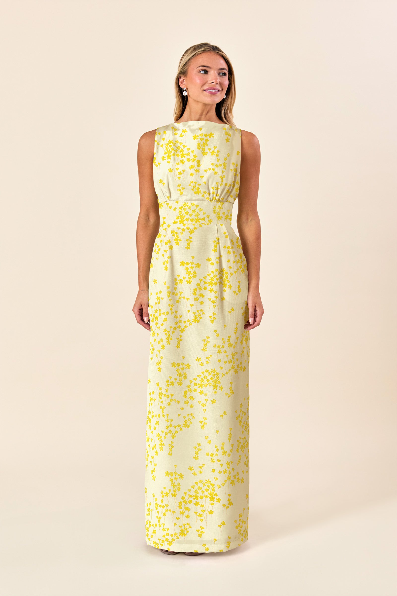 Semi Fitted Bodice and fitted waist with pleated column skirt